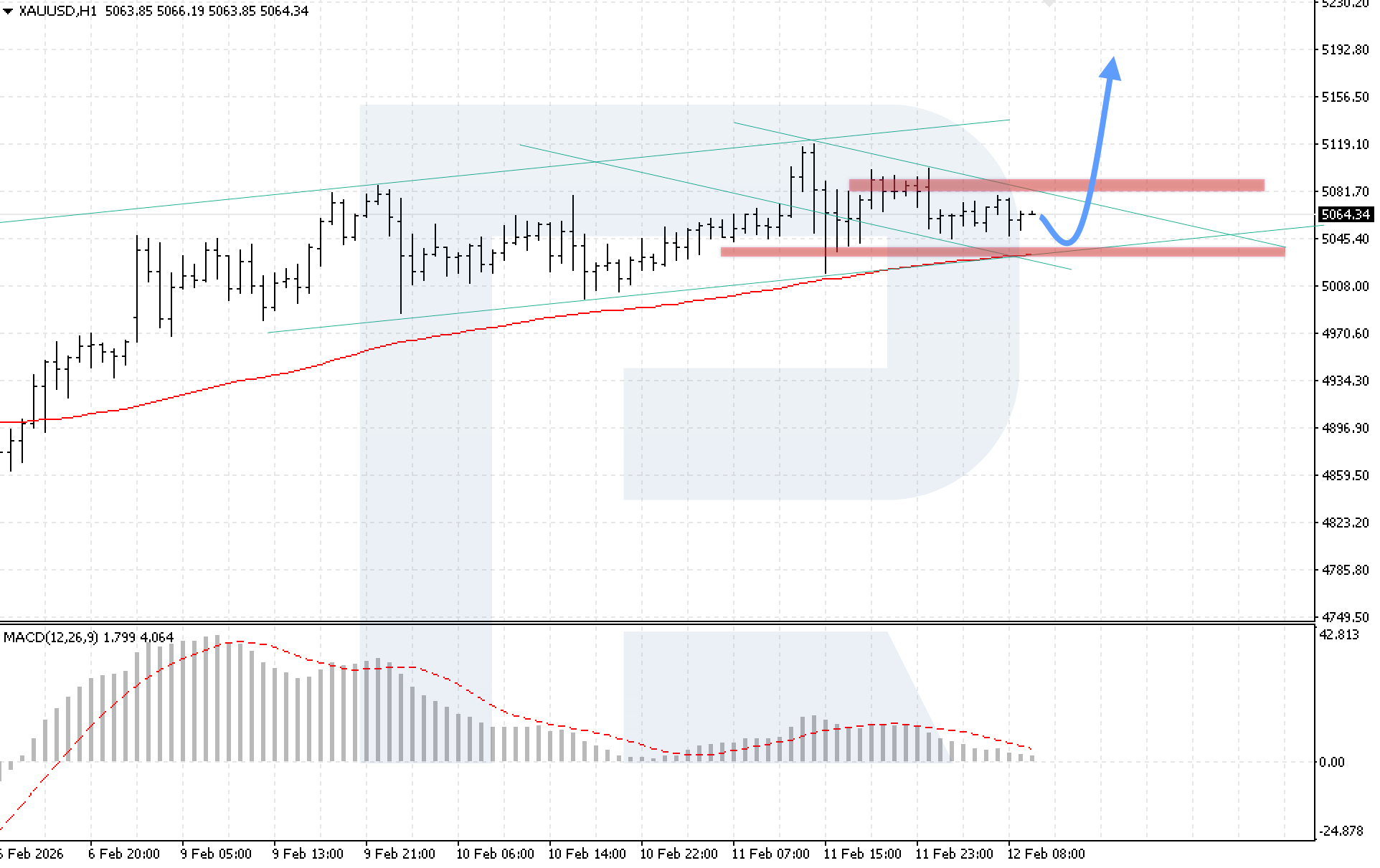 XAUUSD жұбының H4 графигінде нарық консолидация аясында қозғалып жатыр. Баға 5,080 қарсылық пен 5,040 қолдау деңгейлері арасында қалып отыр. Бүгін, 12 ақпан 2026, негізгі сценарий жергілікті қолдаудан кері серпіліп, 5,195 деңгейіне дейін өсуді жалғастыруды қарастырады.