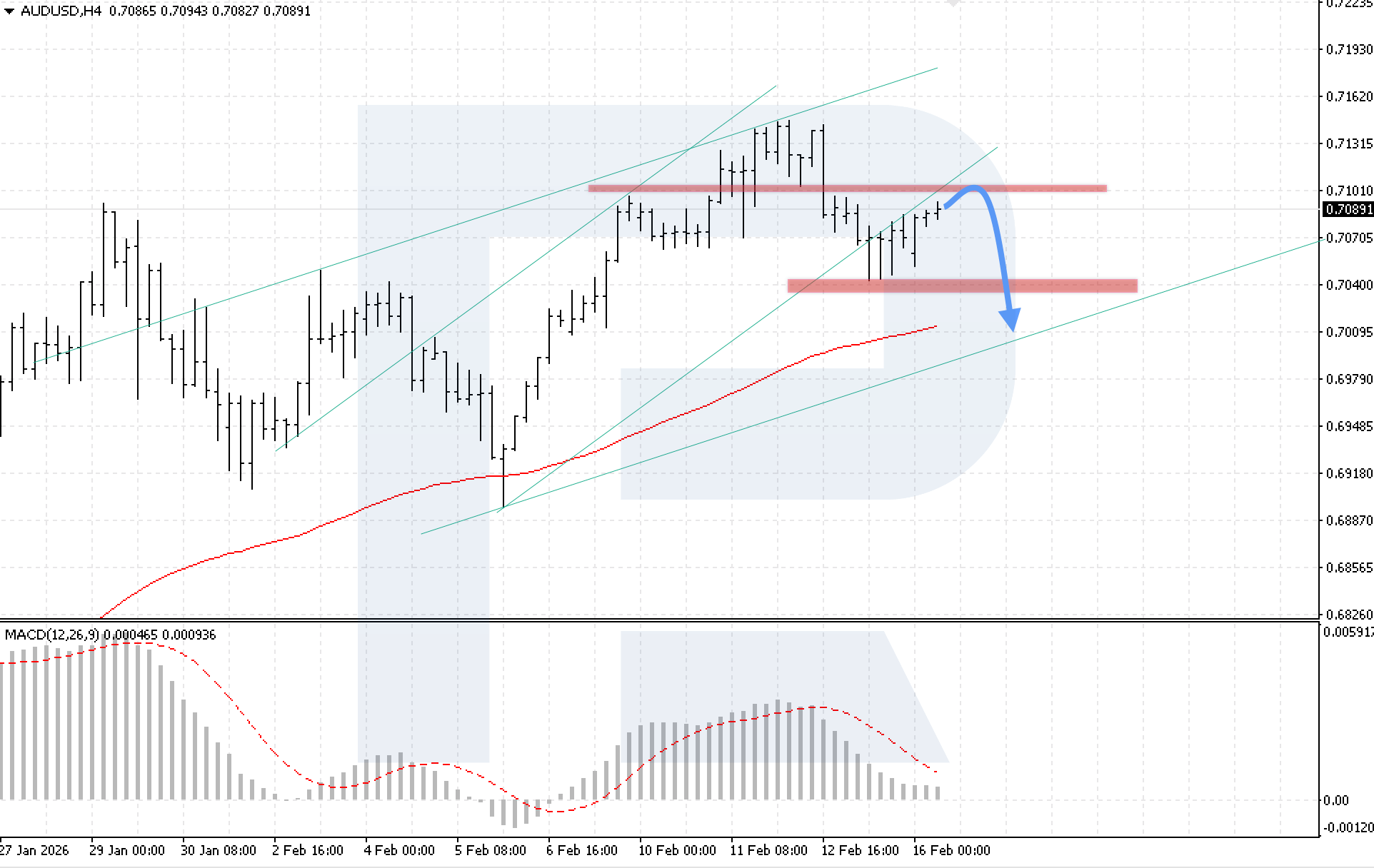 Бүгін, 16 February 2026, базалық сценарий 0.7005 деңгейіне дейін төмендеу импульсінің дамуын қарастырады.