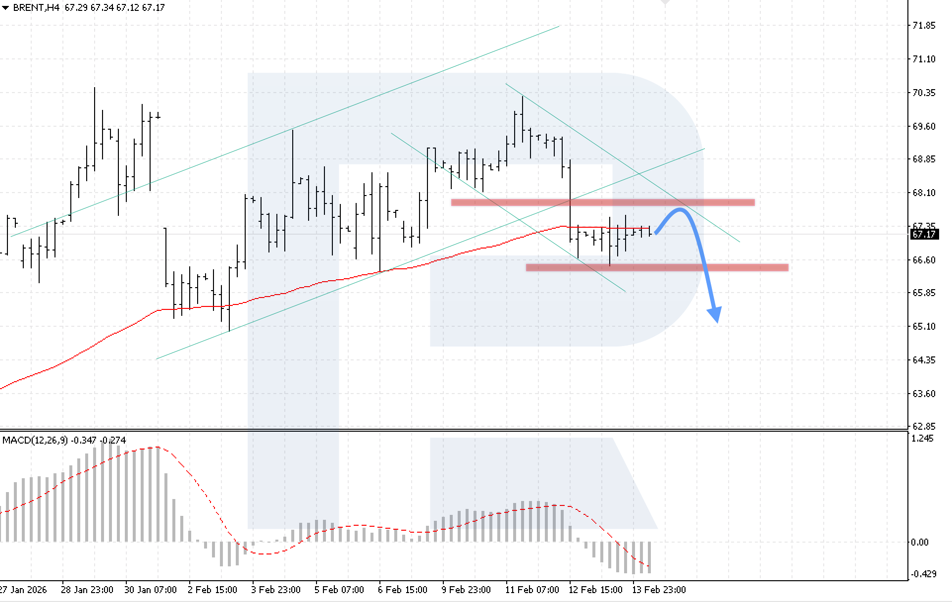 H4 таймфрейміндегі Brent мұнайының графигінде нарық төмендеуші арна шеңберінде түзетілуде. Сатушылар бағаны EMA-85 сызығынан төмен ұстап, аюлы қысымды күшейтуде. Бүгін, 16 February 2026, базалық сценарий төмендеуші арнаның жоғарғы шекарасынан серпіліп, 65.10 деңгейіне дейін төмендеуді жалғастыруды қарастырады.