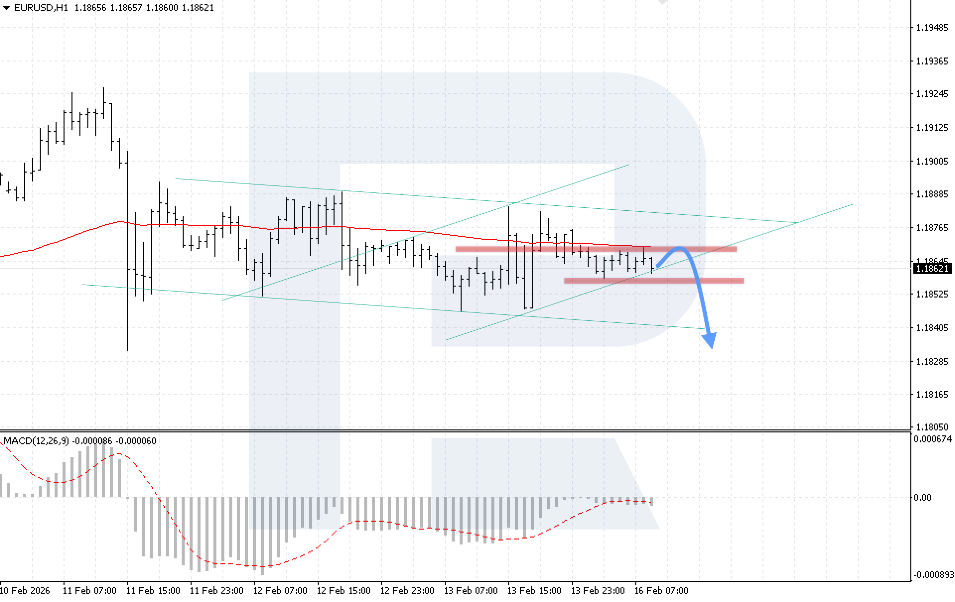 H1 таймфрейміндегі EURUSD валюта жұбының графигінде нарық консолидация шеңберінде қозғалысын жалғастыруда. Бағалар өсуші түзету арнасының төменгі шекарасынан серпілуде. Сатушылар бағаны EMA-85 сызығынан төмен ұстап тұр, бұл аюлы қысымның күшейіп келе жатқанын көрсетеді. Бүгін, 16 February 2026, базалық сценарий 1.1875 деңгейіндегі жергілікті қарсылықтан серпіліп, кейін 1.1835 деңгейіне дейін төмендеуді көздейді.