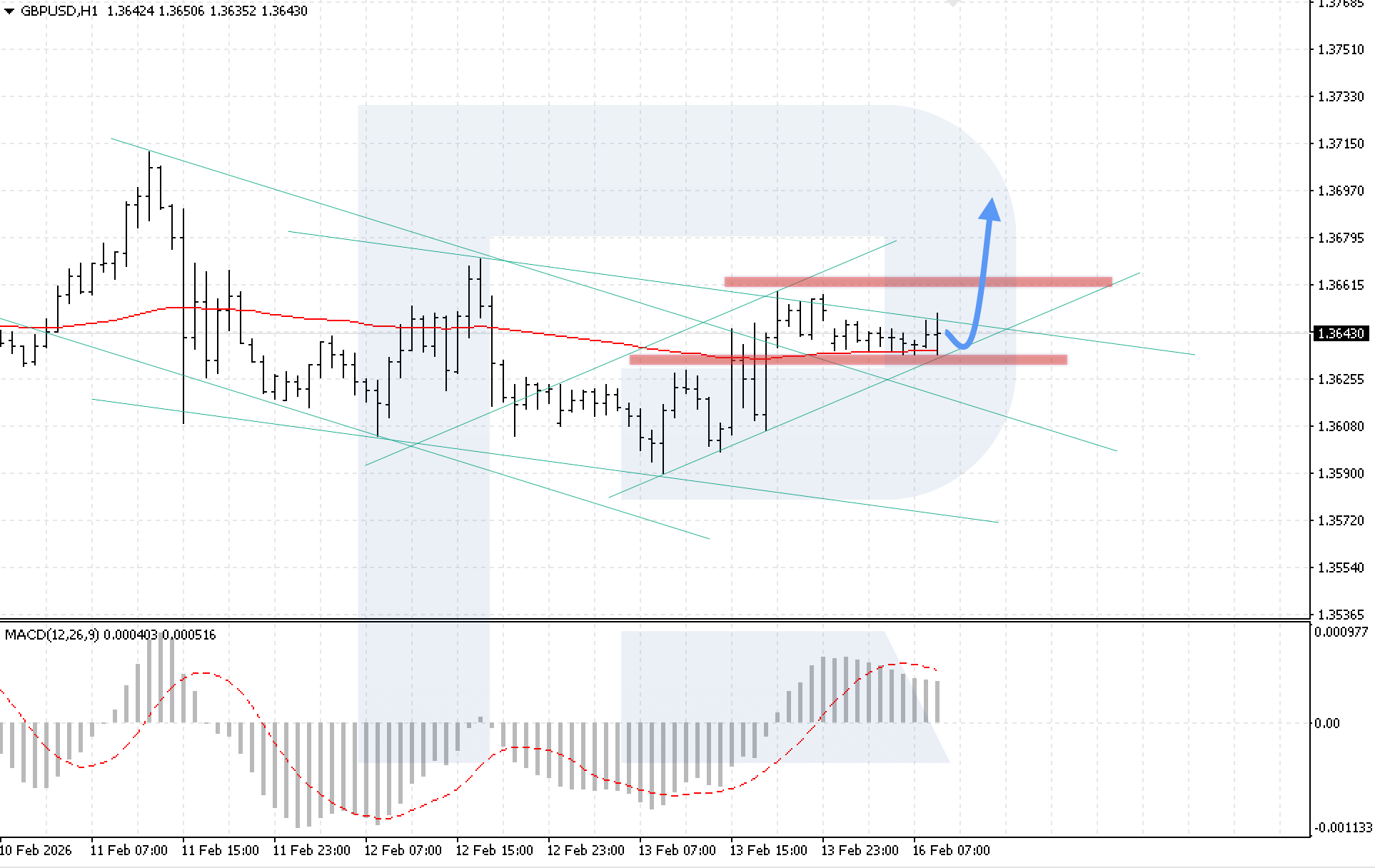 H1 таймфрейміндегі GBPUSD валюта жұбының графигінде бағалар түзету шеңберінде қозғалысын жалғастыруда. Сатып алушылар EMA-85 сызығынан жоғары бекініп, тұрақты бычий қысымды растауда. Ең жақын қарсылық 1.3660 деңгейінде орналасқан. Бүгін, 16 February 2026, базалық сценарий төмендеуші арнаның төменгі шекарасынан серпіліп, кейін 1.3695 деңгейіне дейін өсуді қарастырады.