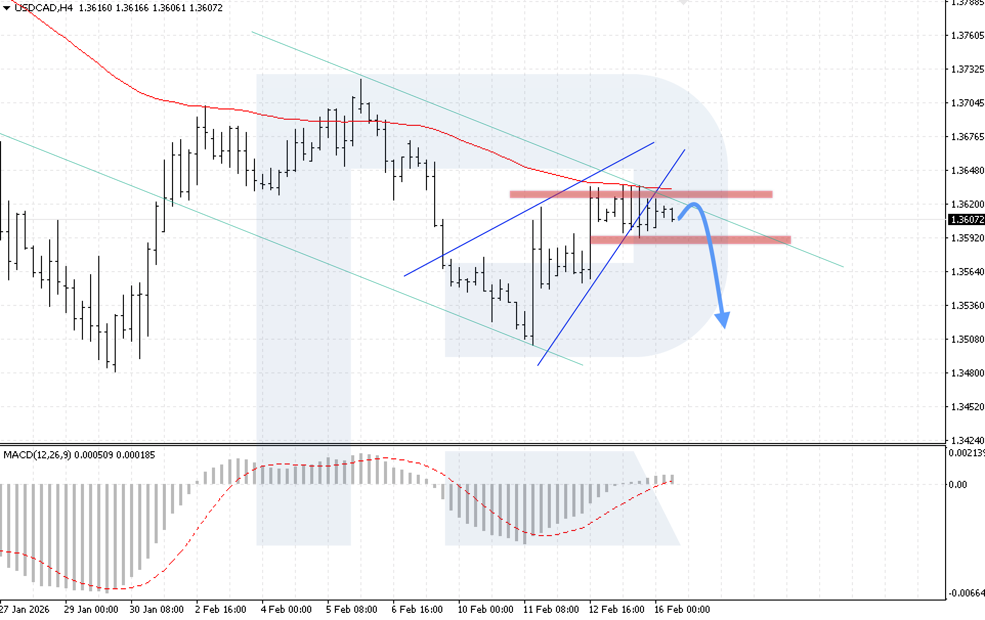 H4 таймфрейміндегі USDCAD валюта жұбының графигінде нарық бычий түзету шеңберінде қозғалысын жалғастыруда, ал бағалар Wedge reversal pattern шекарасынан шықты. Бүгін, 16 February 2026, базалық сценарий төмендеуші арнаның жоғарғы шекарасынан серпіліп, 1.3505 деңгейіне дейін төмендеуді қарастырады.