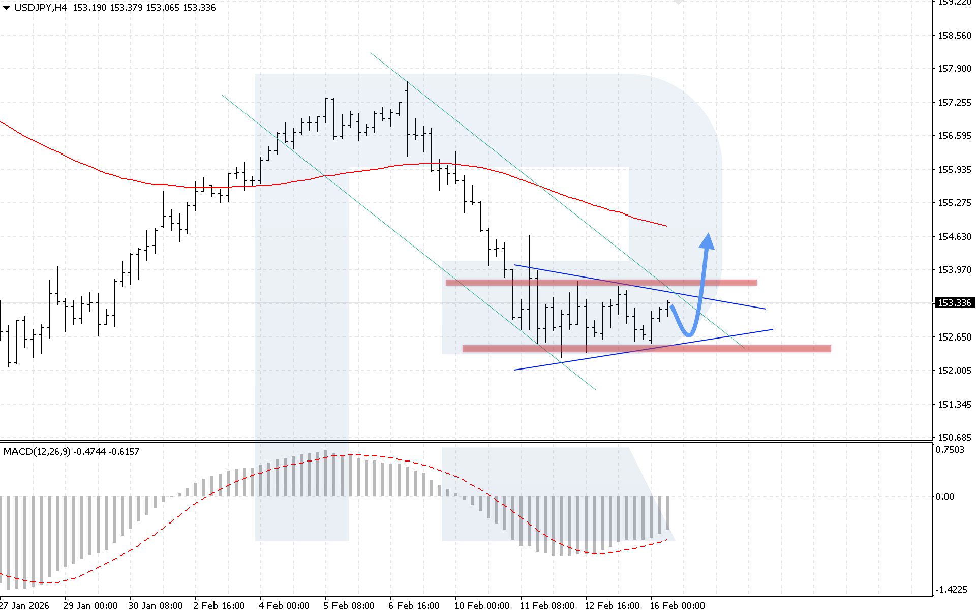 Техникалық көрініс бұл сценарийді растайды. MACD индикаторы кеңейіп жатқан гистограмманы көрсетеді, сондай-ақ бычий дивергенция қалыптасқан, бұл төмендеу әлеуетін айтарлықтай шектейді. Өсу сценарийін іске асыру үшін негізгі шарт — үлгінің жоғарғы шекарасын бұзып, 153.85 деңгейінен жоғары бекітілу.