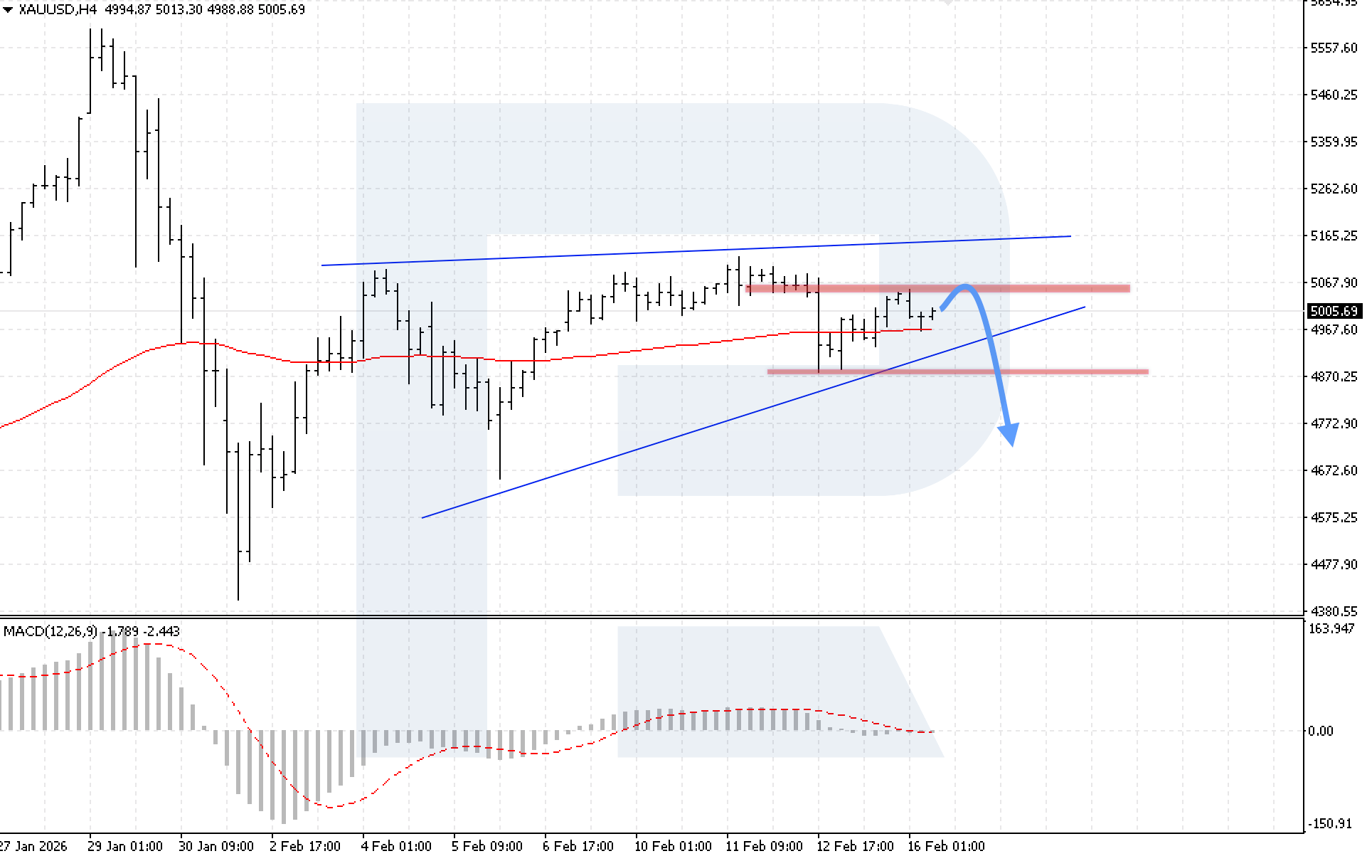 H4 таймфрейміндегі XAUUSD валюта жұбының графигінде нарық EMA-75 сызығынан жоғары бекінді, алайда Wedge reversal pattern қалыптасу қаупі сақталуда. Бүгін, 16 February 2026, базалық сценарий 4,765 деңгейіне дейін төмендеу импульсінің дамуын қарастырады.