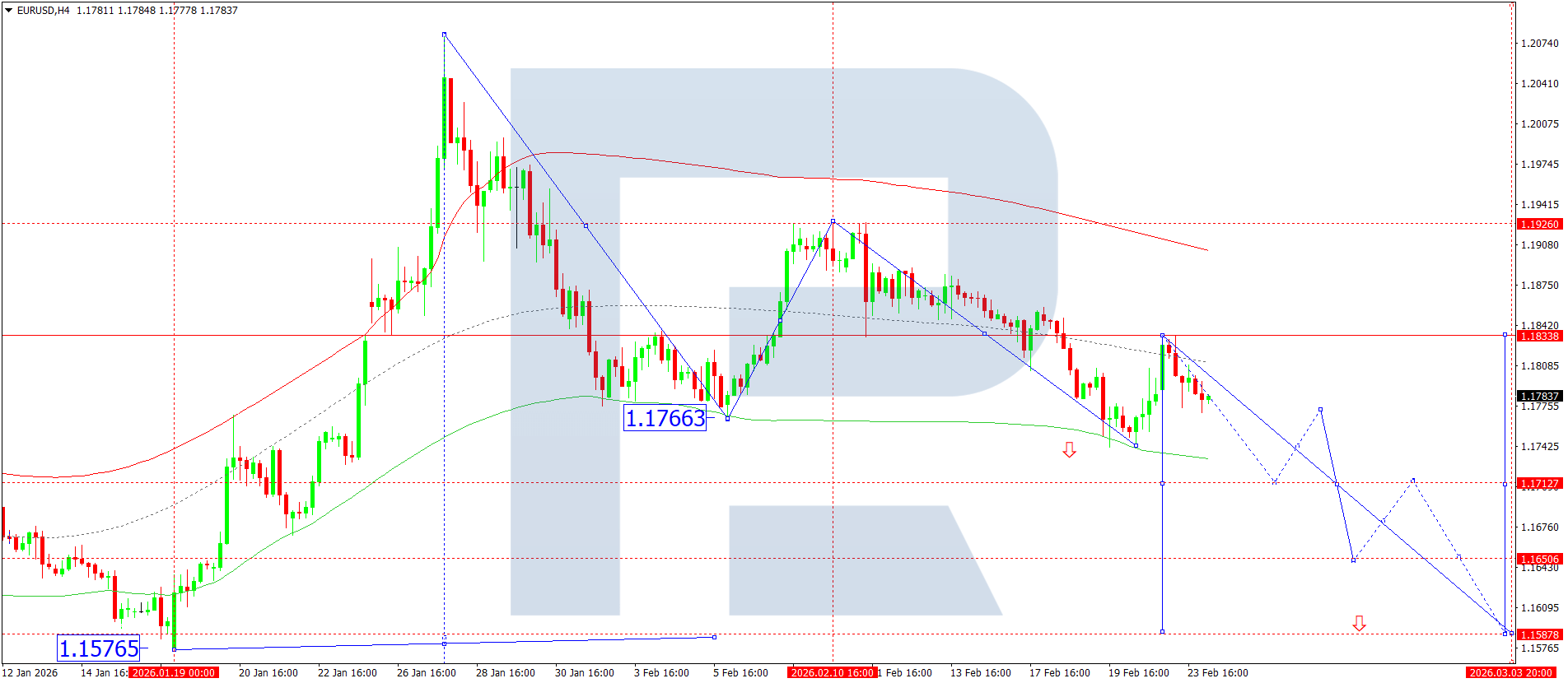 H4 таймфрейміндегі EURUSD жұбының графигінде нарық 1.1835 деңгейіне дейінгі түзету толқынын аяқтап, 1.1717 бағытына қарай төмендеу құрылымын қалыптастыра бастады. Бүгін, 2026 жылғы 24 ақпан, 1.1777 деңгейінен төмен бұзылу және 1.1717 деңгейіне дейін төмендеудің жалғасу ықтималдығын қарастырамыз. Егер бұл деңгей төмен қарай бұзылса, 1.1650 бағытына дейін кеңейтілген қозғалыс әлеуеті ашылады. Мақсат — жергілікті.