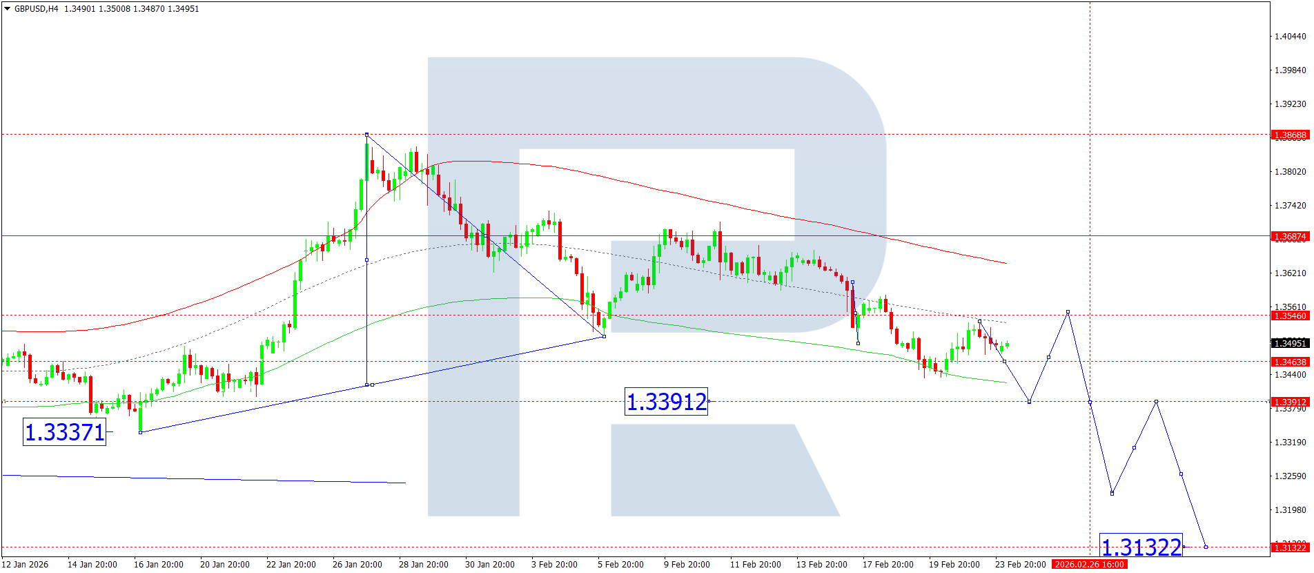 H4 таймфрейміндегі GBPUSD жұбының графигінде нарық 1.3515 деңгейінен жоғары бұзылып, 1.3536 деңгейіне дейін түзету толқынын аяқтады. Бүгін, 2026 жылғы 24 ақпан, 1.3391 деңгейіне дейін төмендеудің жалғасуын күтеміз. Егер бұл деңгей де бұзылса, 1.3222 бағытына қарай қозғалыс әлеуеті ашылады.