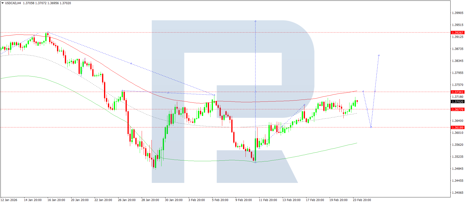 H4 таймфрейміндегі USDCAD жұбының графигінде нарық 1.3737 бағытына қарай өсу құрылымын қалыптастыруда. Бүгін, 2026 жылғы 24 ақпан, осы мақсат деңгейіне жету күтіледі. Одан кейін 1.3636 деңгейіне дейін түзету ықтимал.