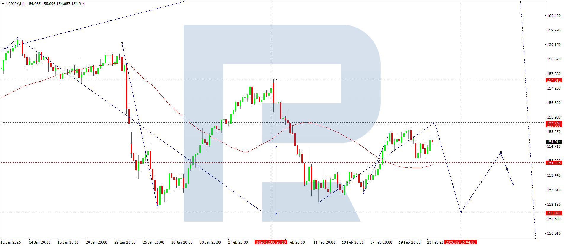 H4 таймфрейміндегі USDJPY жұбының графигінде нарық 154.00 деңгейі маңында консолидация диапазонын қалыптастыруда. Бүгін, 2026 жылғы 24 ақпан, 155.75 деңгейіне дейін өсу мүмкіндігін жоққа шығаруға болмайды, кейін 151.80 деңгейіне дейін төмендеу ықтимал. Одан кейін тағы бір өсу толқыны 155.75 бағытына қарай қарастырылады.