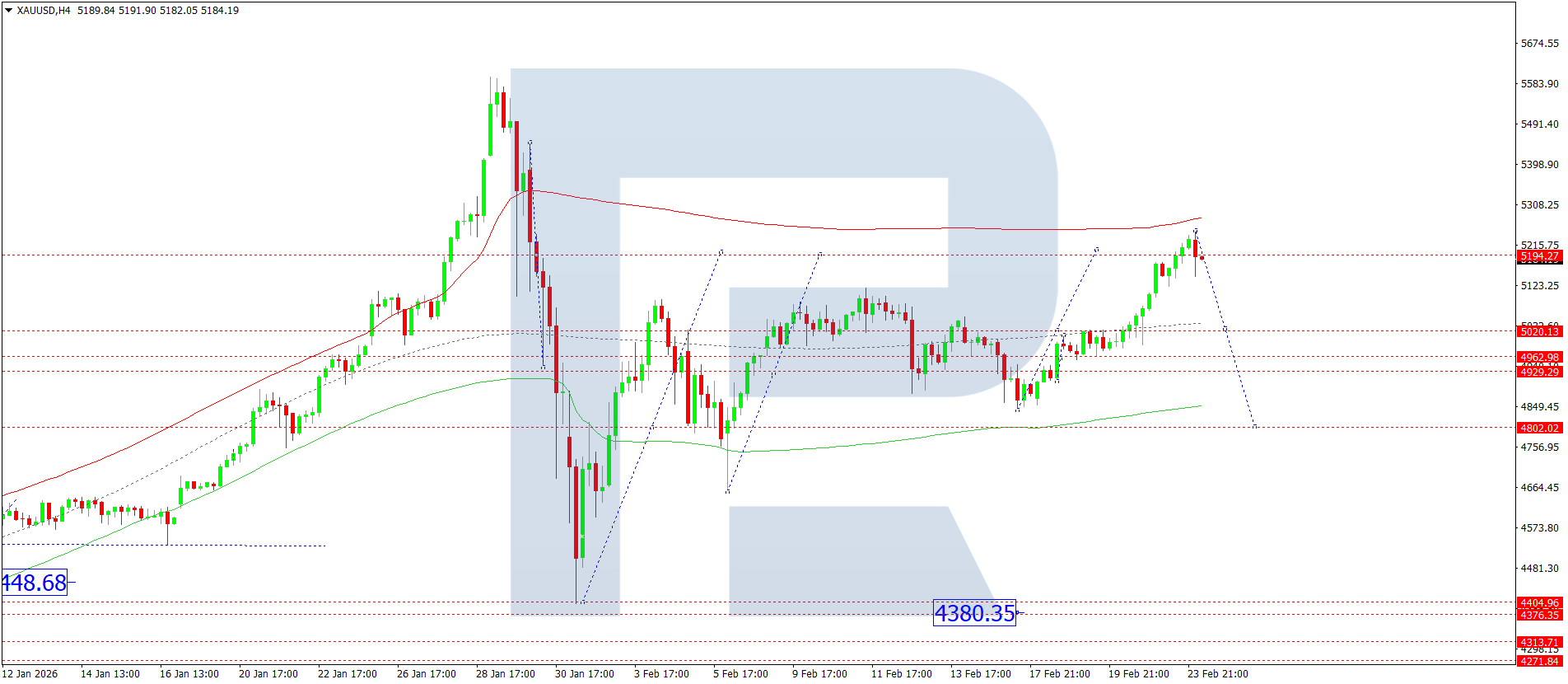 H4 таймфрейміндегі XAUUSD графигінде нарық 5240 деңгейіне дейін өсу толқынын аяқтады. Бүгін, 2026 жылғы 24 ақпан, 5020 деңгейіне дейін төмендеудің басталуын күтеміз. Егер бұл деңгей бұзылса, 4800 бағытына қарай қозғалыс әлеуеті ашылады.