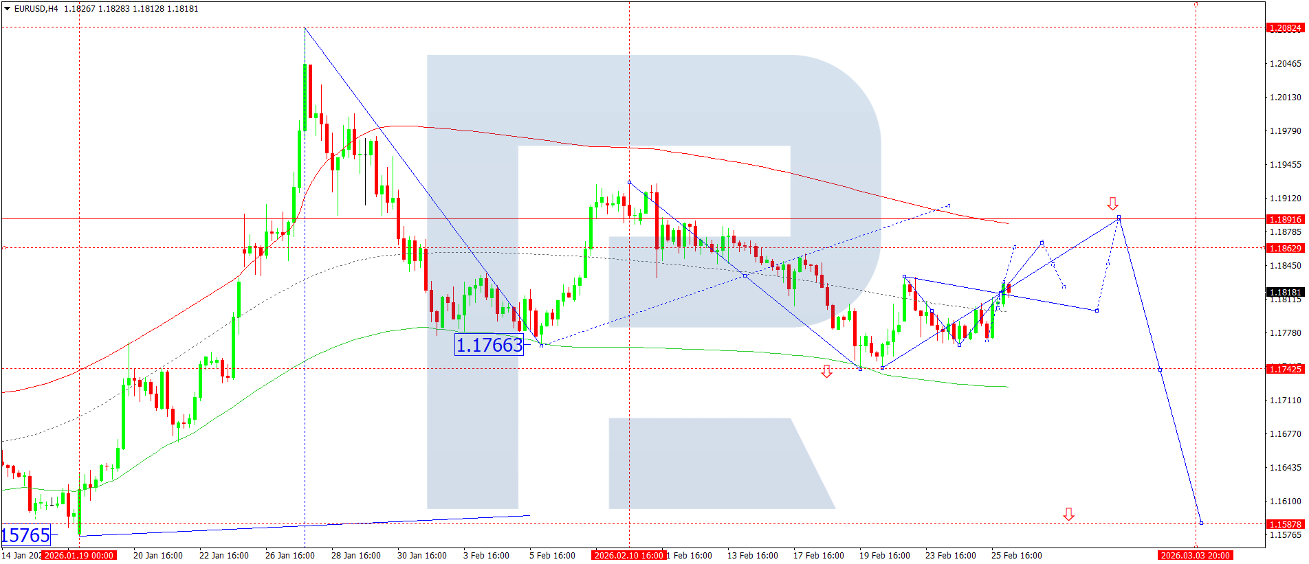 H4 таймфрейміндегі EURUSD жұбының графигінде нарық 1.1818 деңгейінен жоғары бұзылып, 1.1866 бағытына қарай өсу толқынын дамытуы мүмкін. Бүгін, 2026 жылғы 26 ақпан, 1.1818 деңгейі маңында консолидация диапазоны қалыптасуын жалғастыруда. Жоғары бағытта бұзылу жағдайында түзету 1.1860 деңгейіне дейін кеңеюі мүмкін. Төмен қарай бұзылу 1.1745 деңгейіне дейін төмендеу әлеуетін ашады, әрі қарай трендтің 1.1650 деңгейіне дейін жалғасу перспективасы бар, бұл — жергілікті мақсат.