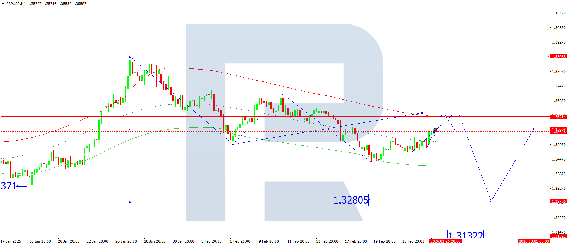 H4 таймфрейміндегі GBPUSD жұбының графигінде нарық 1.3560 деңгейінен жоғары бұзылып, 1.3620 бағытына қарай толқын құрылымын қалыптастыруда. Бүгін, 2026 жылғы 26 ақпан, осы мақсатқа жету күтіледі, кейін 1.3460 деңгейіне дейін төмендеудің жалғасуы ықтимал. Егер бұл деңгей бұзылса, 1.3222 бағытына қарай қозғалыс әлеуеті ашылады.
