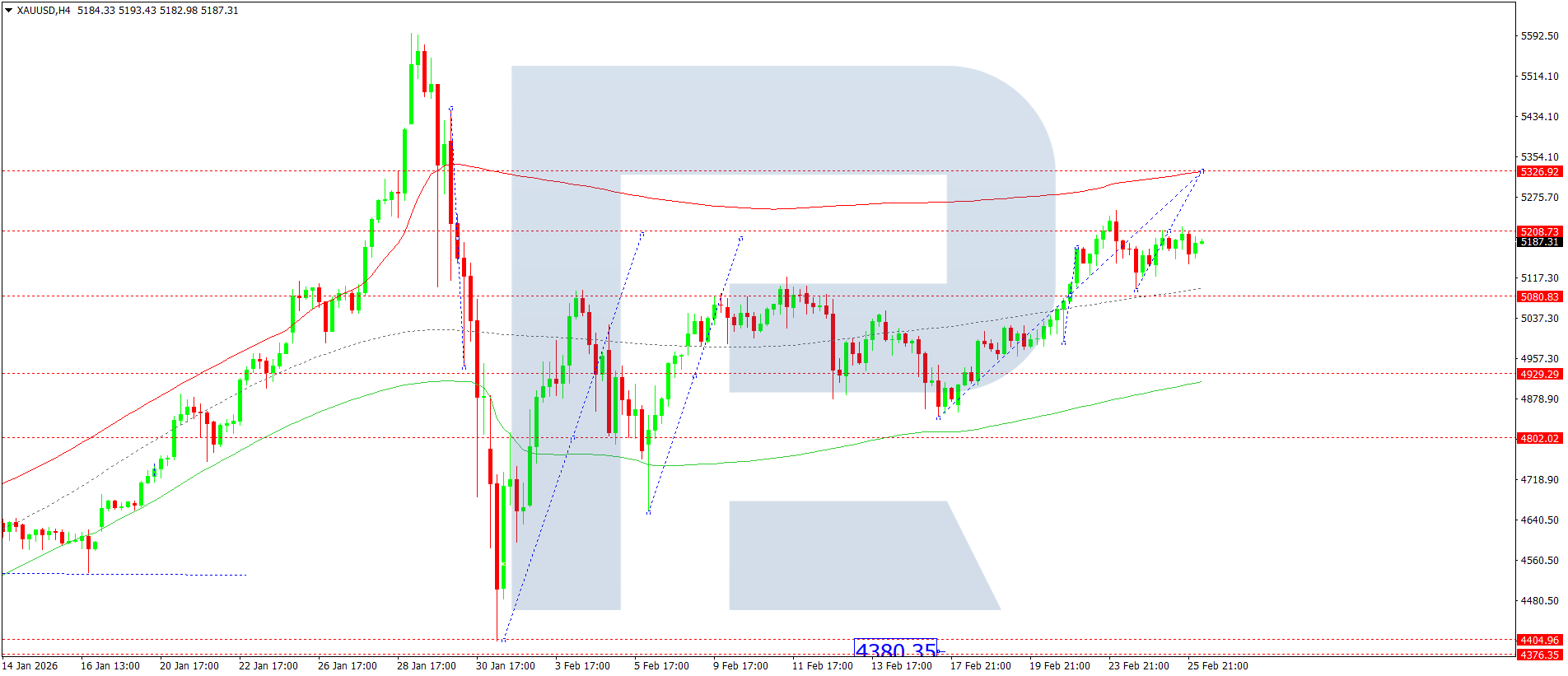 H4 таймфрейміндегі XAUUSD графигінде нарық 5,326 деңгейіне дейін өсу толқынын қалыптастыруда. Бүгін, 2026 жылғы 26 ақпан, осы мақсат деңгейіне жету күтіледі. Одан кейін 5,080 деңгейіне дейін төмендеудің басталу ықтималдығы қарастырылады. Егер бұл деңгей бұзылса, 4,930 бағытына қарай қозғалыс әлеуеті ашылады.