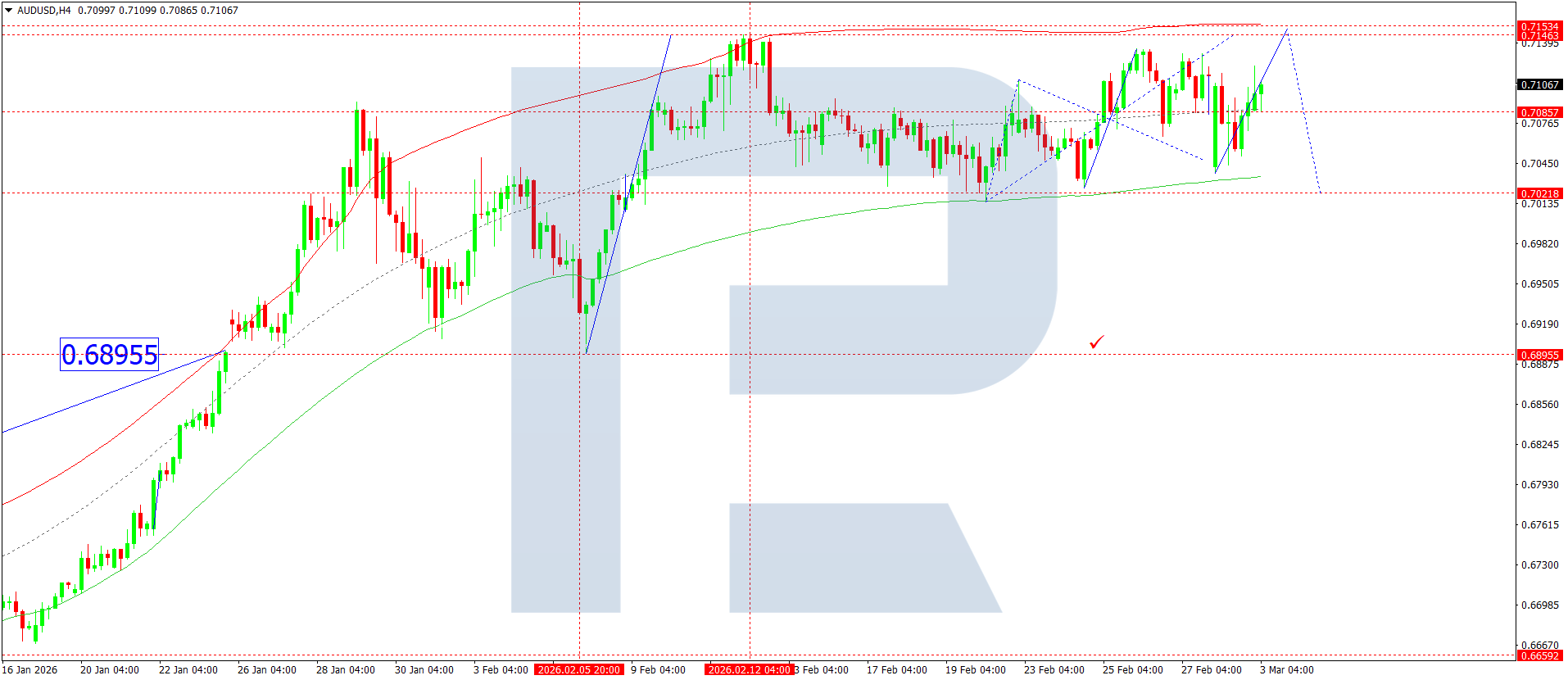 AUDUSD жұбының H4 графигінде нарық 0.7117 деңгейінен жоғары бұзылып, 0.7150 деңгейіне дейін өсу траекториясын жалғастыруда. Бүгін, 3 наурыз 2026, 0.7117 деңгейі маңында консолидация диапазонының қалыптасуы күтіледі. Жоғары бағытта бұзылу 0.7150 деңгейіне дейін өсуге мүмкіндік ашады. Төмен бағытта бұзылу жағдайында толқын 0.7028 деңгейіне дейін созылуы мүмкін. Одан кейін осы деңгей маңында консолидация диапазоны қалыптасуы ықтимал.