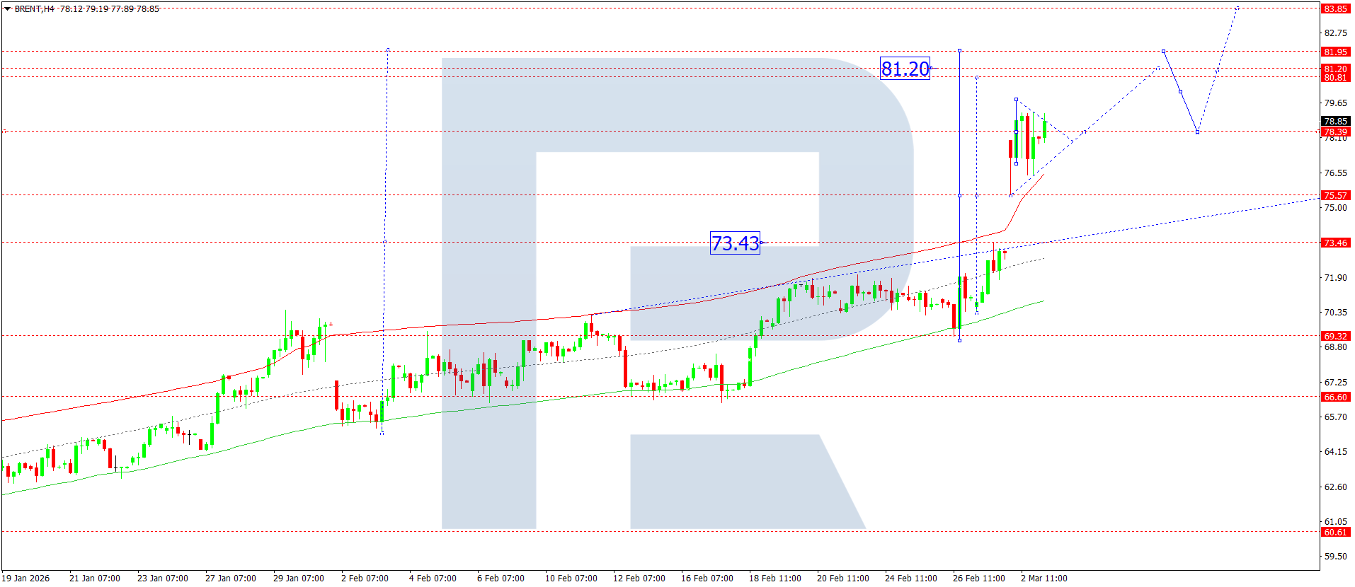 Brent мұнайының H4 графигінде нарық 78.40 деңгейінен жоғары бұзылып, 81.95 деңгейіне дейін өсу толқынын жалғастыруда. Бүгін, 3 наурыз 2026, осы баға деңгейіне жету күтіледі. Одан кейін баға 75.55 деңгейін мақсат еткен түзетуші төмендеу басталуы мүмкін.