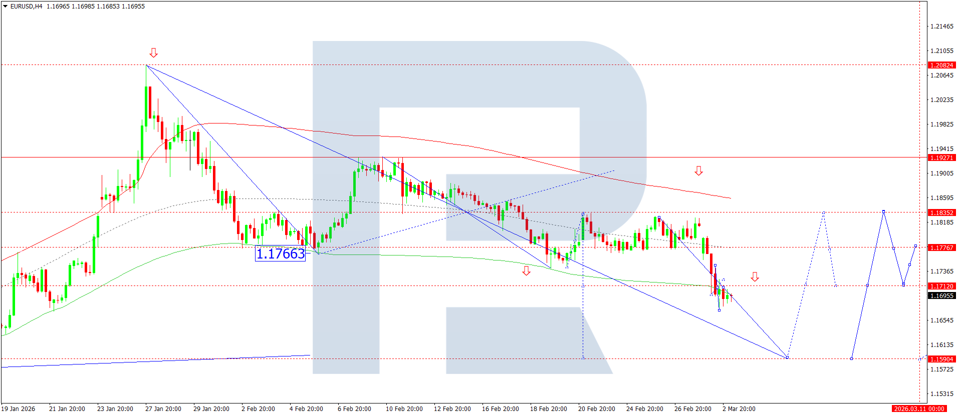 EURUSD жұбының H4 графигінде нарық 1.1712 деңгейінен төмен бұзылып, 1.1676 деңгейіне жетіп, төмендеу толқыны құрылымын аяқтады. Бүгін, 3 наурыз 2026, жұптың 1.1590 деңгейіне дейін, яғни бірінші мақсатқа қарай әрі қарай төмендеуі күтіледі. Одан кейін 1.1712 деңгейіне дейін түзету ықтимал.
