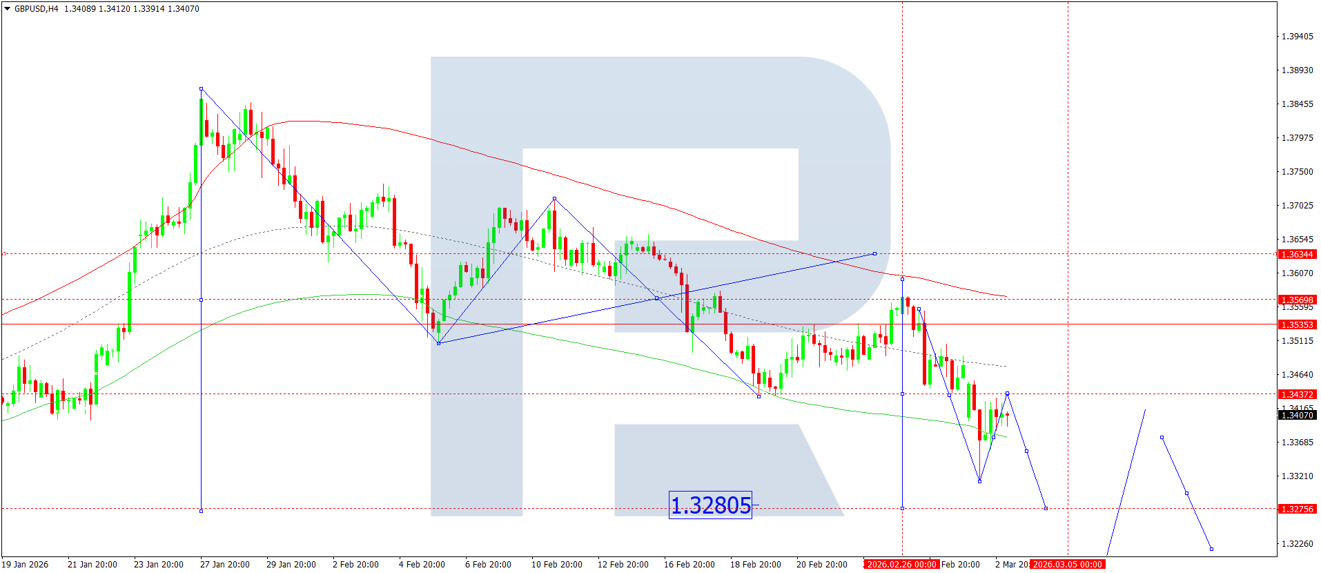 GBPUSD жұбының H4 графигінде нарық 1.3434 деңгейінен төмен бұзылып, 1.3280 деңгейіне қарай, яғни бірінші мақсатқа бағытталған толқын құрылымын қалыптастыруды жалғастыруда. Бүгін, 3 наурыз 2026, 1.3280 деңгейіне қозғалыс күтіледі, одан кейін 1.3434 деңгейіне дейін түзету болуы мүмкін. Бұдан соң 1.3353 деңгейіне дейін төмендеу болжанады.