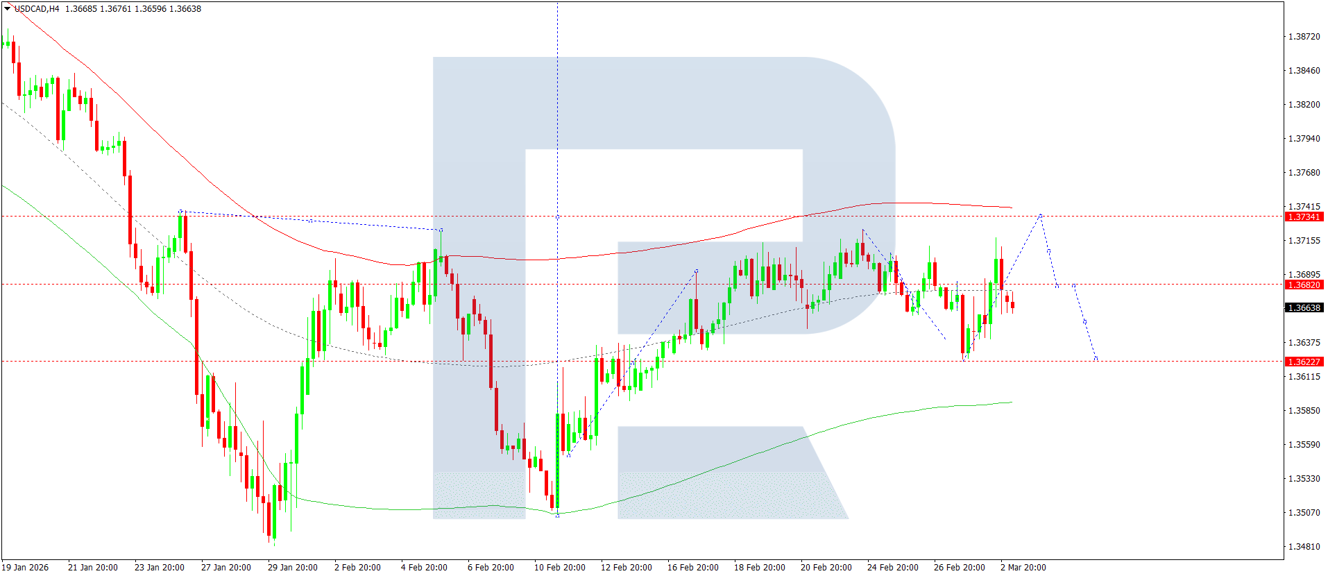 USDCAD жұбының H4 графигінде нарық 1.3686 деңгейі маңында консолидация диапазонын қалыптастыруда. Бүгін, 3 наурыз 2026, жоғары бағытта бұзылу 1.3737 деңгейіне дейін қозғалысқа жол ашады. Егер бұл деңгей де бұзылса, тренд 1.3800 деңгейіне дейін жалғасады деп күтіледі.