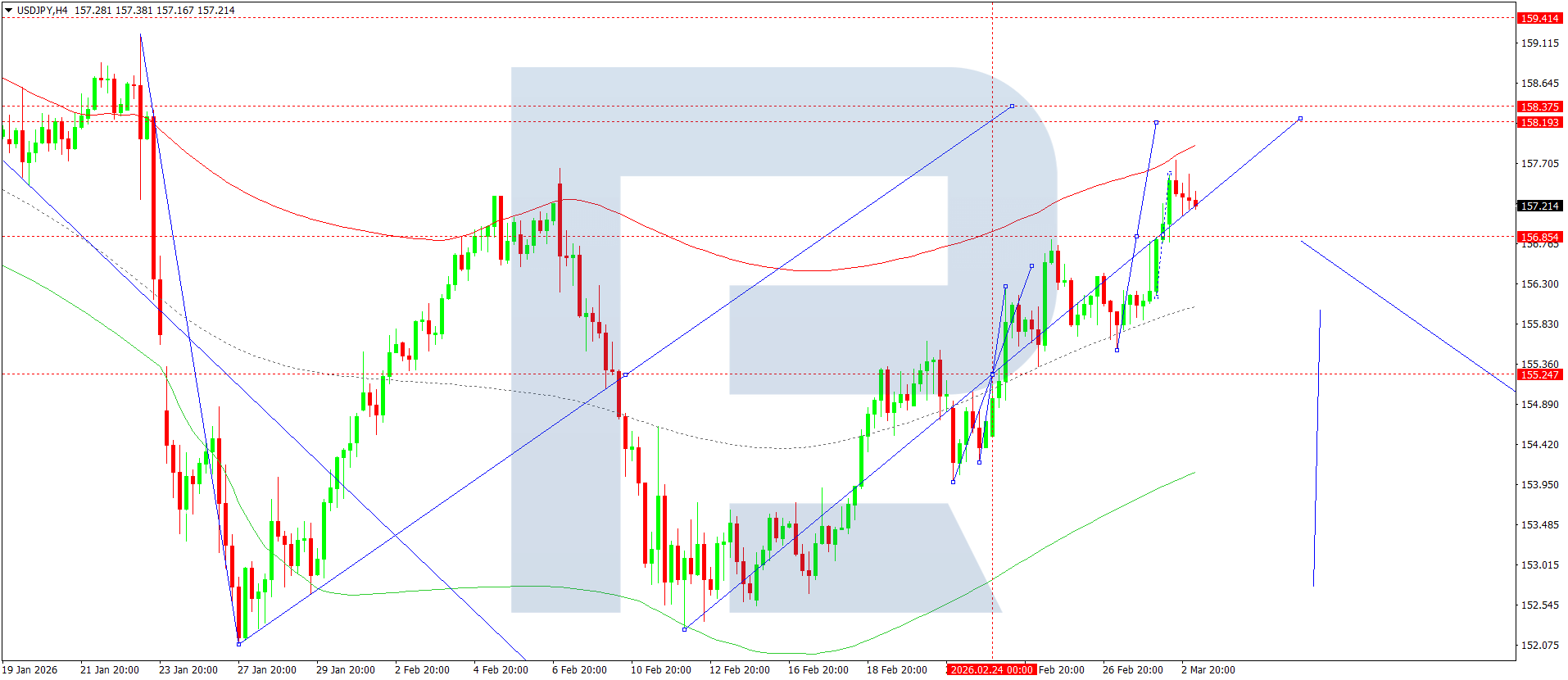 USDJPY жұбының H4 графигінде нарық 156.85 деңгейі маңында консолидация диапазонын қалыптастыруда. Бүгін, 3 наурыз 2026, диапазоннан жоғары бағытта бұзылу 158.20 деңгейіне дейін қозғалыс әлеуетін ашады. Керісінше, төмен бағытта бұзылу жағдайында төмендеу толқыны 155.45 деңгейіне дейін жалғасуы мүмкін. Одан кейін 158.40 деңгейіне қарай өсу толқыны ықтимал.