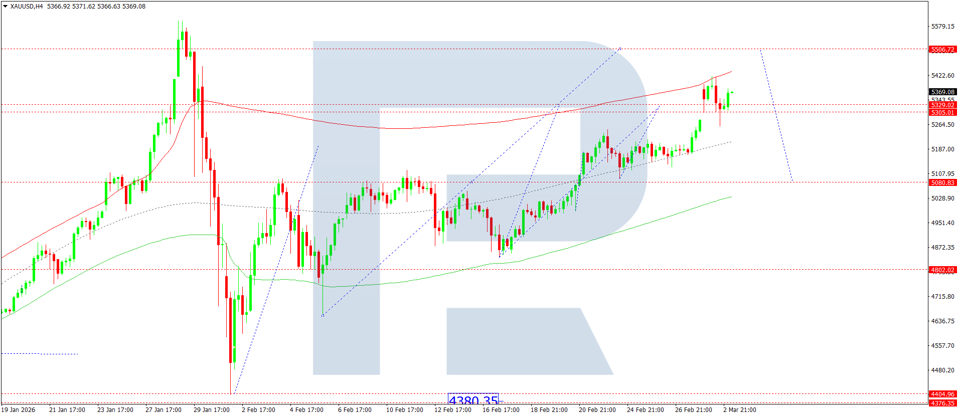 XAUUSD жұбының H4 графигінде нарық 5,419 деңгейіне жетіп, өсу толқынын аяқтады. Бүгін, 3 наурыз 2026, осы деңгейден төмен консолидация диапазонының қалыптасуы күтіледі. Диапазоннан жоғары бағытта бұзылу 5,511 деңгейіне дейін толқынның дамуына мүмкіндік ашады, ал төмен бағытта бұзылу 5,080 деңгейіне дейін түзетуші қозғалысты тудыруы мүмкін.