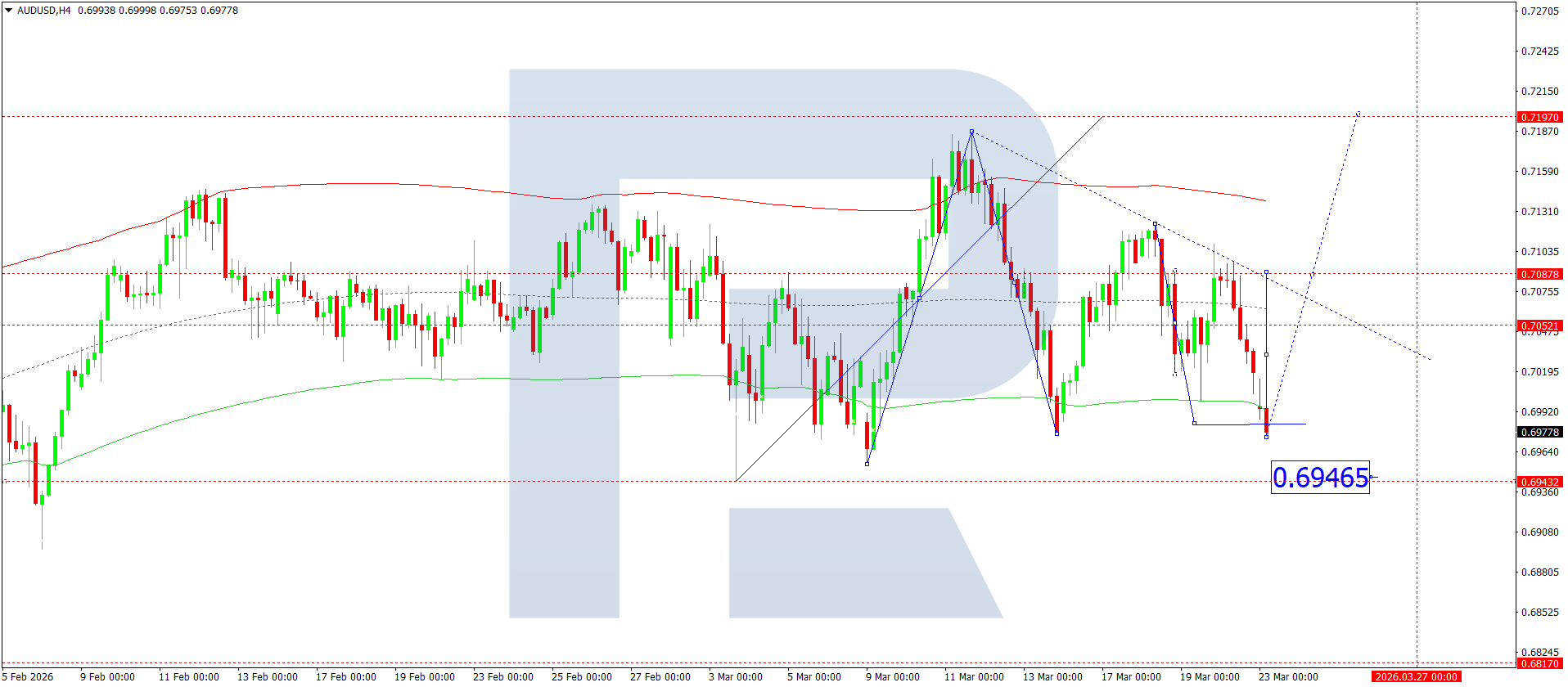 AUDUSD жұбының H4 графигінде нарық 0.6982 деңгейінен төмен бұзылып, 0.6920 бағытына қарай қозғалысын жалғастыруда. Бүгін, 23 наурыз 2026, осы деңгей маңында консолидация диапазоны қалыптасуы күтіледі. Төмен бағытта бұзылу 0.6900 деңгейіне дейін одан әрі төмендеуге әкелуі мүмкін. Ал жоғары бағытта бұзылу 0.6800 деңгейіне дейін өсу толқынын бастауға мүмкіндік береді.