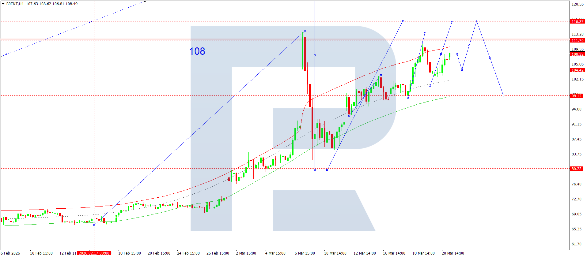 Brent мұнайының H4 графигінде нарық 108.60 деңгейіне дейін өсу толқынын аяқтады. Бүгін, 23 наурыз 2026, 104.40 деңгейіне дейін түзету күтіледі. Одан кейін жаңа өсу толқыны басталып, 116.37 деңгейіне дейін жетуі мүмкін, бұл — жергілікті мақсат.