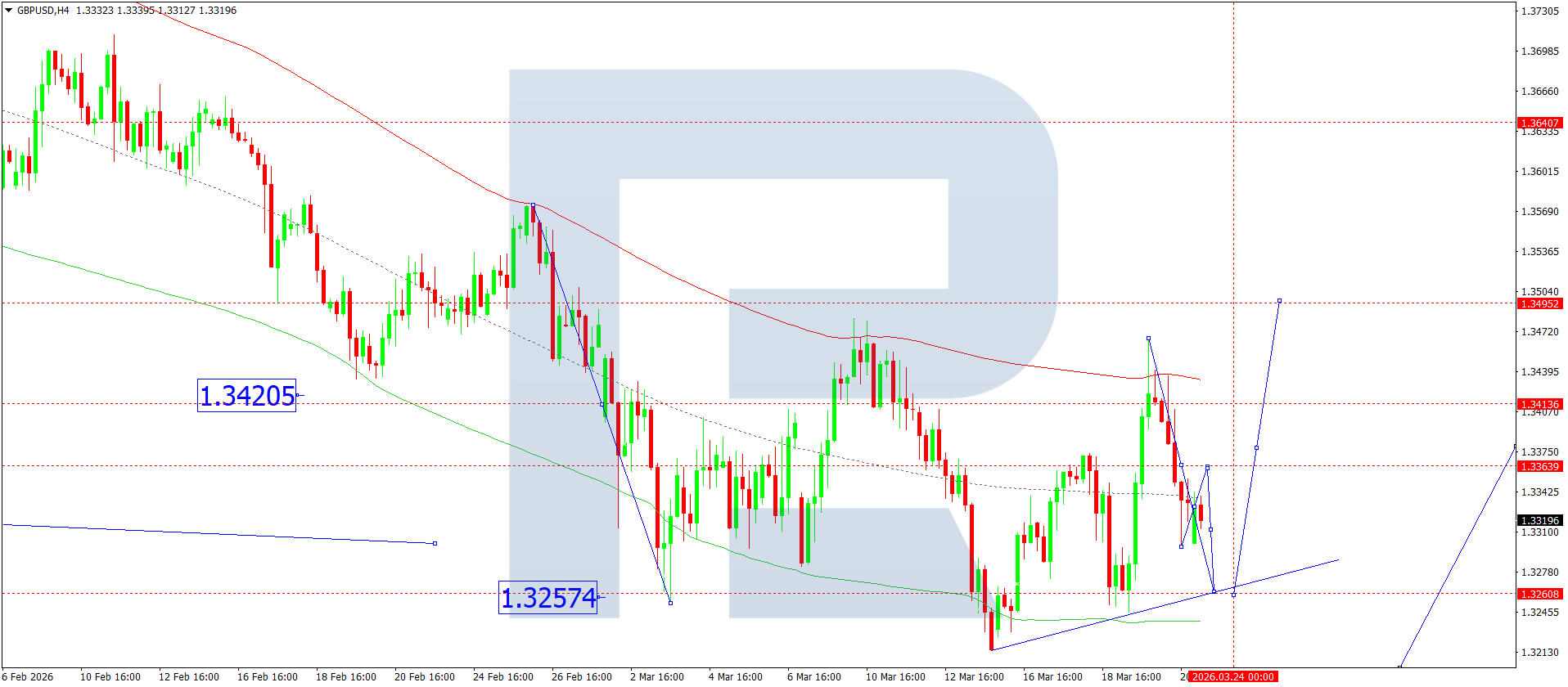 GBPUSD жұбының H4 графигінде нарық 1.3300 деңгейіне дейін төмендеу толқынын қалыптастырды. Бүгін, 23 наурыз 2026, төмендеу 1.3262 деңгейіне дейін жалғасады деп күтіледі. Одан кейін осы деңгейден жоғары консолидация диапазоны қалыптасуы мүмкін. Төмен бағытта бұзылу 1.3200 деңгейіне дейін төмендеу әлеуетін ашады. Керісінше, жоғары бағытта бұзылу 1.3494 деңгейіне дейін өсуге мүмкіндік береді, бұл — жергілікті мақсат. Осы деңгейге жеткеннен кейін 1.3354 деңгейіне дейін төмендеу болуы мүмкін.