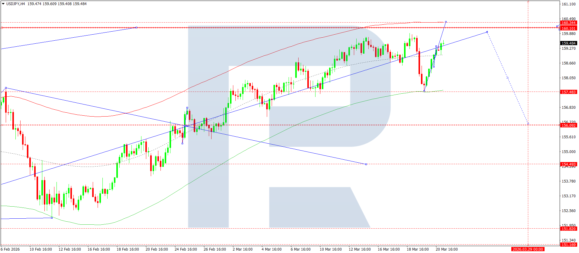 USDJPY жұбының H4 графигінде нарық 159.00 деңгейінен жоғары бұзылып, 159.60 деңгейіне дейін өсу толқынын аяқтады. Бүгін, 23 наурыз 2026, өсу толқынының 160.30 деңгейіне дейін жалғасуы күтіледі. Кейін осы деңгей маңында консолидация диапазоны қалыптасуы мүмкін. Жоғары бағытта бұзылу 161.00 деңгейіне дейін қозғалысқа жол ашады. Керісінше, төмен бағытта бұзылу 156.10 деңгейіне дейін түзету қозғалысын бастауға мүмкіндік береді.