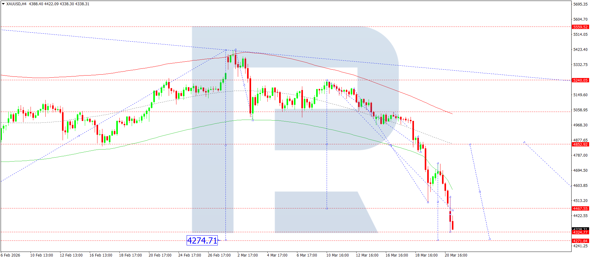 XAUUSD H4 графигінде нарық 4,500 деңгейінен төмен бұзылып, 4,272 бағытына қарай төмендеу толқынын қалыптастыруда. Бүгін, 23 наурыз 2026, 4,800 деңгейіне дейін өсу толқыны басталады деп күтіледі, әрі қарай трендтің 4,850 деңгейіне дейін жалғасу перспективасы бар. Балама сценарий ретінде, төмен бағытта бұзылу болған жағдайда 4,200 деңгейіне дейін қосымша төмендеу мүмкін.