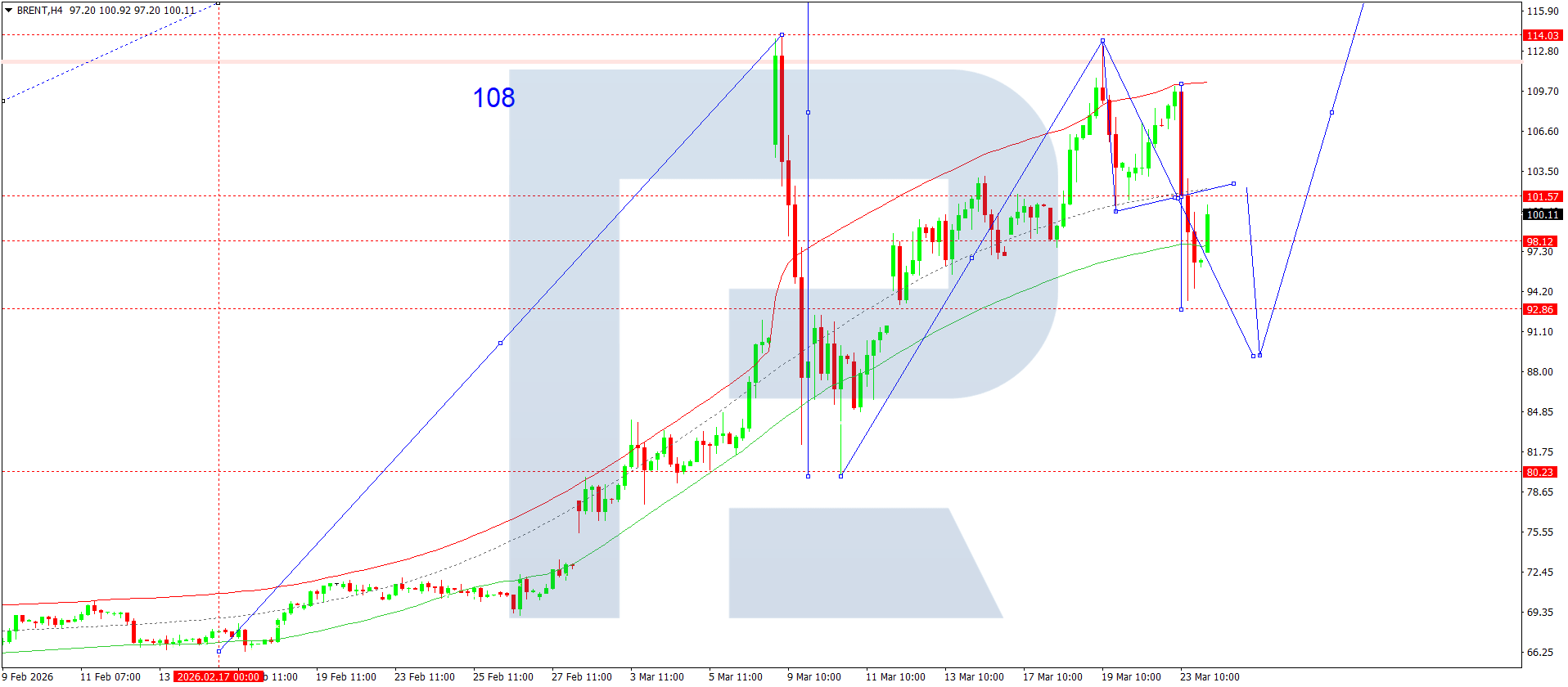 Brent мұнайының H4 графигінде нарық 93.00 деңгейіне дейін төмендеу толқынын аяқтады. Бүгін, 24 наурыз 2026, баға 101.55 деңгейіне дейін өсуі мүмкін, содан кейін 90.00 деңгейіне дейін төмендеуі ықтимал. Кейін 126.60 деңгейіне дейін өсу жалғасады деп күтіледі, бұл — жергілікті мақсат.
