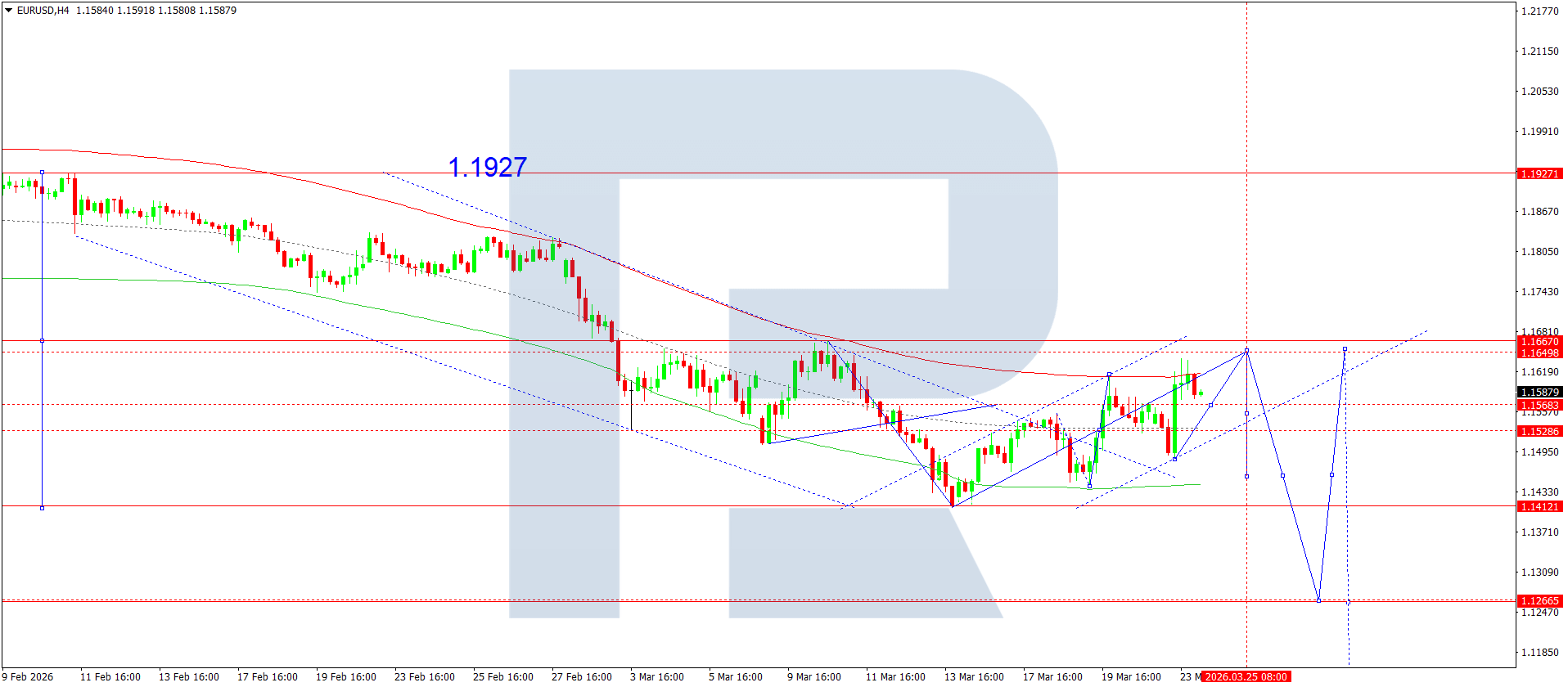 EURUSD жұбының H4 графигінде нарық 1.1485 деңгейіне дейін төмендеу толқынын аяқтап, 1.1635 деңгейіне дейін өсу қозғалысын көрсетті. Бүгін, 24 наурыз 2026, 1.1568 деңгейі маңында консолидация диапазоны қалыптасты. Жоғары бағытта бұзылу 1.1650 деңгейіне дейін түзетудің жалғасу әлеуетін ашады, ал төмен бағытта бұзылу төмендеу толқынын 1.1455 деңгейіне дейін кеңейтуі мүмкін.