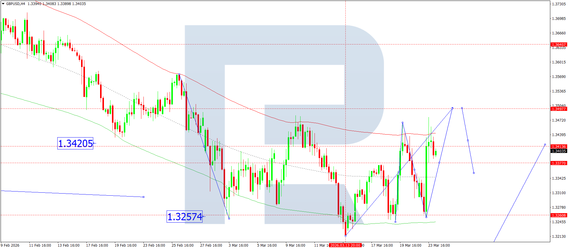 GBPUSD жұбының H4 графигінде нарық 1.3477 деңгейіне дейін өсу толқынын қалыптастырды. Бүгін, 24 наурыз 2026, 1.3377 деңгейіне дейін төмендеу күтіледі. Одан кейін осы деңгейден жоғары консолидация диапазоны қалыптасуы мүмкін. Төмен бағытта бұзылу 1.3200 деңгейіне дейін төмендеу әлеуетін ашады. Керісінше, жоғары бағытта бұзылу 1.3494 деңгейіне дейін өсуге мүмкіндік береді, бұл — жергілікті мақсат. Осы деңгейге жеткеннен кейін баға 1.3354 деңгейіне дейін төмендеуі мүмкін.