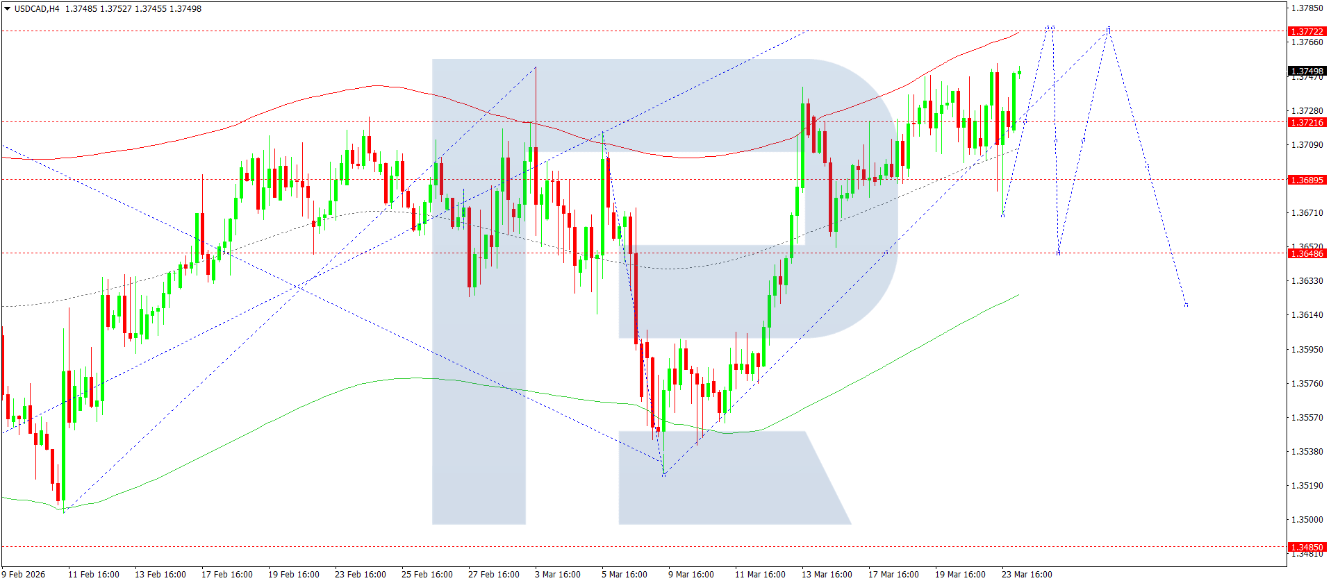 USDCAD жұбының H4 графигінде нарық 1.3772 деңгейіне қарай өсу толқынын қалыптастыруда. Бүгін, 24 наурыз 2026, 1.3772 деңгейіне дейін өсу күтіледі. Одан кейін 1.3636 деңгейіне дейін төмендеу болуы мүмкін.