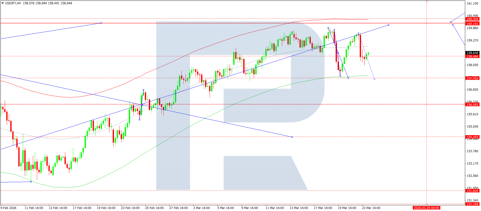 USDJPY жұбының H4 графигінде нарық 158.50 деңгейінен жоғары бұзылып, 159.60 деңгейіне дейін өсу толқынын аяқтады. Бүгін, 24 наурыз 2026, 158.60 деңгейіне дейін төмендеу күтіледі. Кейін осы деңгей маңында консолидация диапазоны қалыптасуы мүмкін. Жоғары бағытта бұзылу 161.00 деңгейіне дейін қозғалысқа жол ашады, ал төмен бағытта бұзылу 157.40 деңгейіне дейін түзету қозғалысын бастауға мүмкіндік береді.