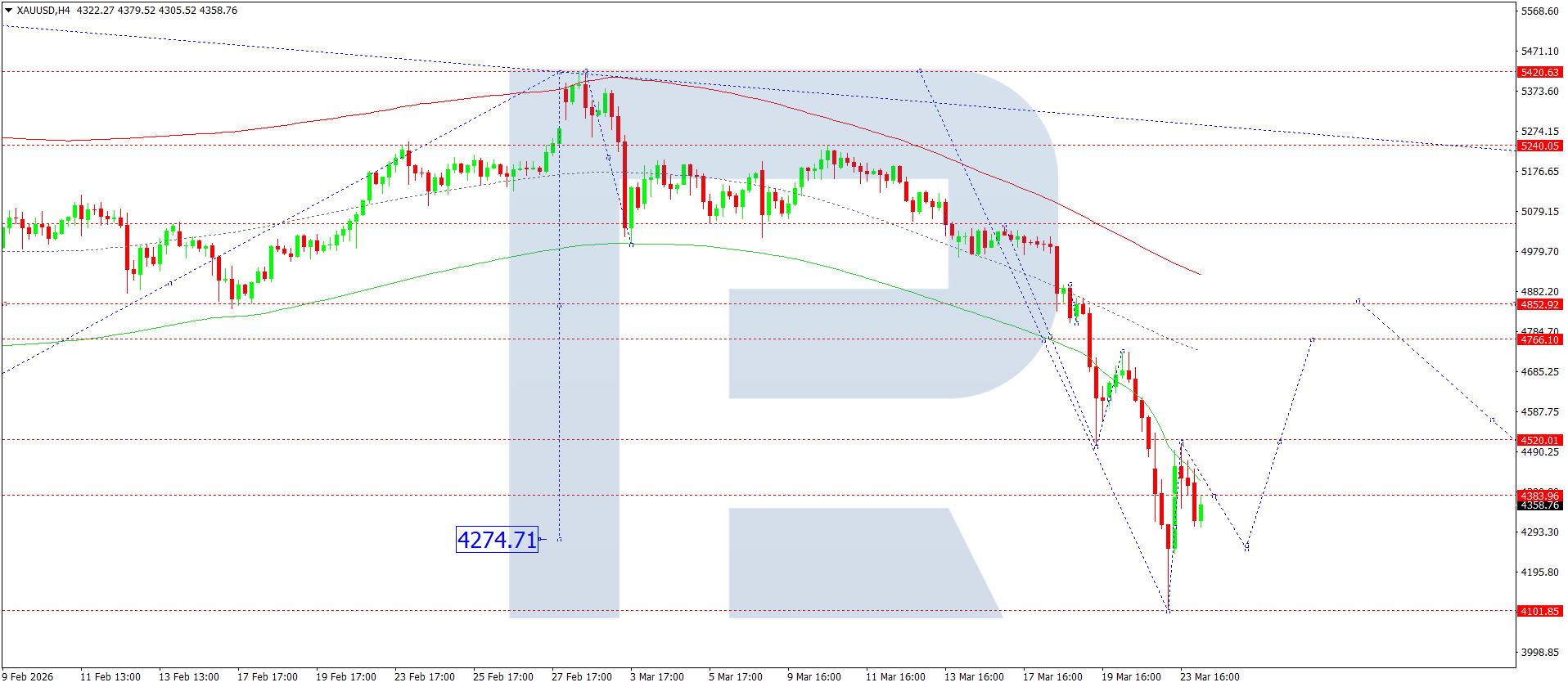 XAUUSD H4 графигінде нарық 4,383 деңгейінен төмен бұзылып, 4,250 бағытына қарай төмендеу толқынын қалыптастыруда. Бүгін, 24 наурыз 2026, осы мақсатты деңгейге жету күтіледі. Одан кейін 4,766 деңгейіне дейін өсу толқыны басталуы мүмкін, әрі қарай трендтің 4,850 деңгейіне дейін жалғасу перспективасы бар. Балама сценарий ретінде, төмен бағытта бұзылу болған жағдайда 4,000 деңгейіне дейін қосымша төмендеу мүмкін.