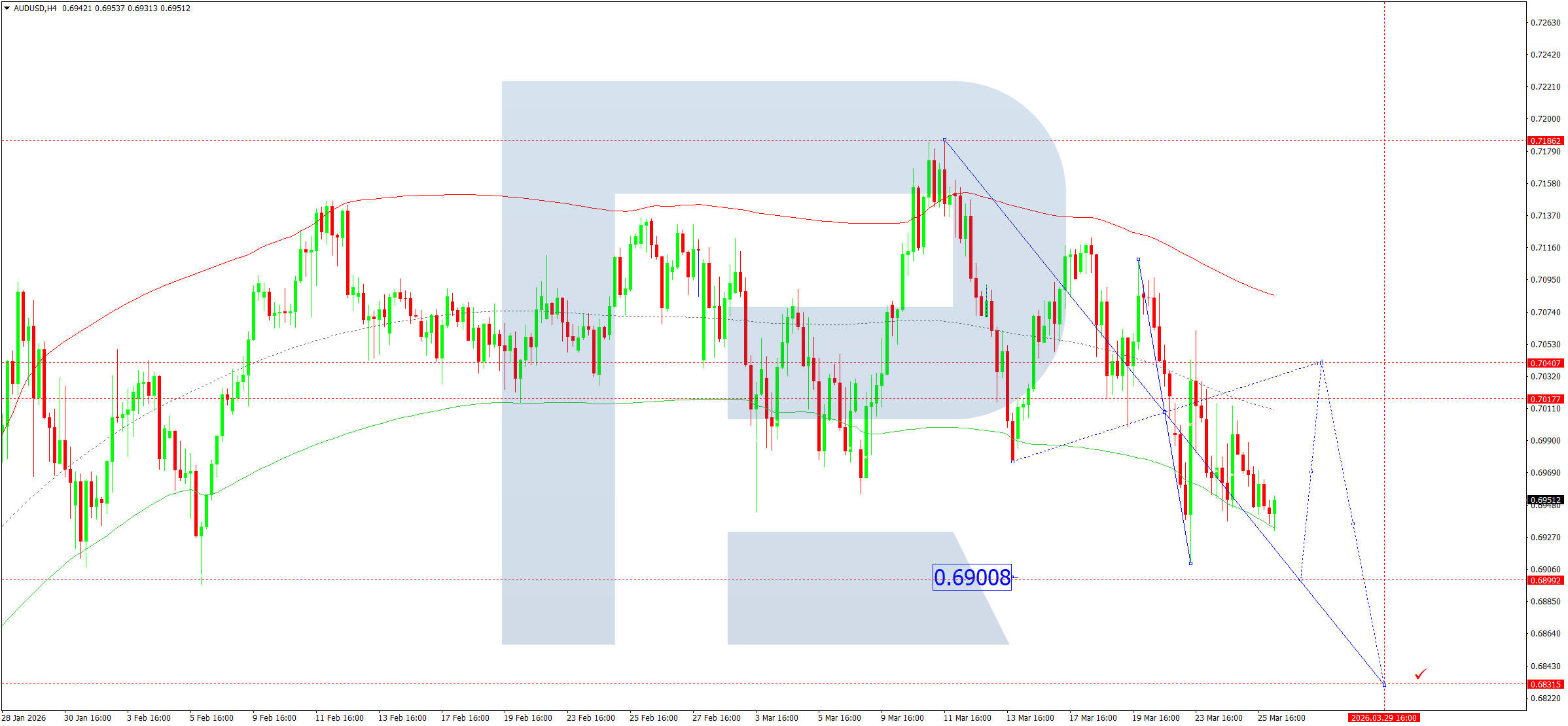 AUDUSD жұбының H4 графигінде нарық 0.6950 деңгейінен төмен бұзылып, 0.6899 бағытына қарай қозғалысын жалғастыруда. Бүгін, 26 наурыз 2026, осы деңгей маңында консолидация диапазоны қалыптасады деп күтіледі. Төмен бағытта бұзылу 0.6830 деңгейіне дейін төмендеуге әкелуі мүмкін, ал жоғары бағытта бұзылу 0.7008 деңгейіне дейін өсу толқынын ашады.