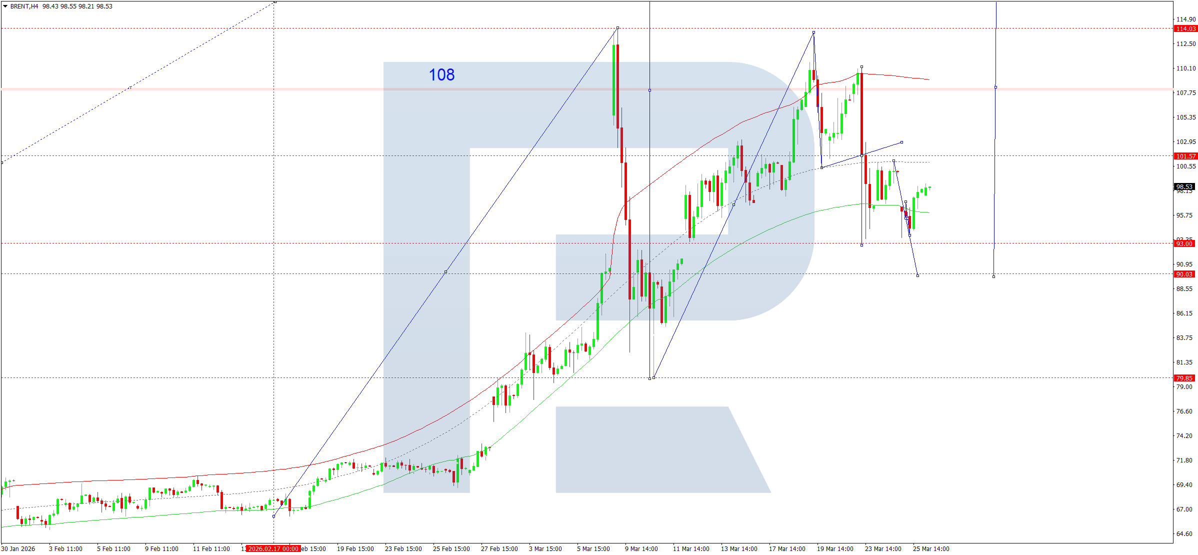 Brent мұнайының H4 графигінде нарық 93.59 деңгейіне дейін төмендеу толқынын аяқтады. Бүгін, 26 наурыз 2026, 101.60 деңгейіне дейін өсу ықтималдығы жоғары. Осы деңгейден жоғары бұзылу 103.00 деңгейіне дейін әрі қарай өсуді ашады және трендтің 108.88 деңгейіне дейін жалғасу перспективасы бар.