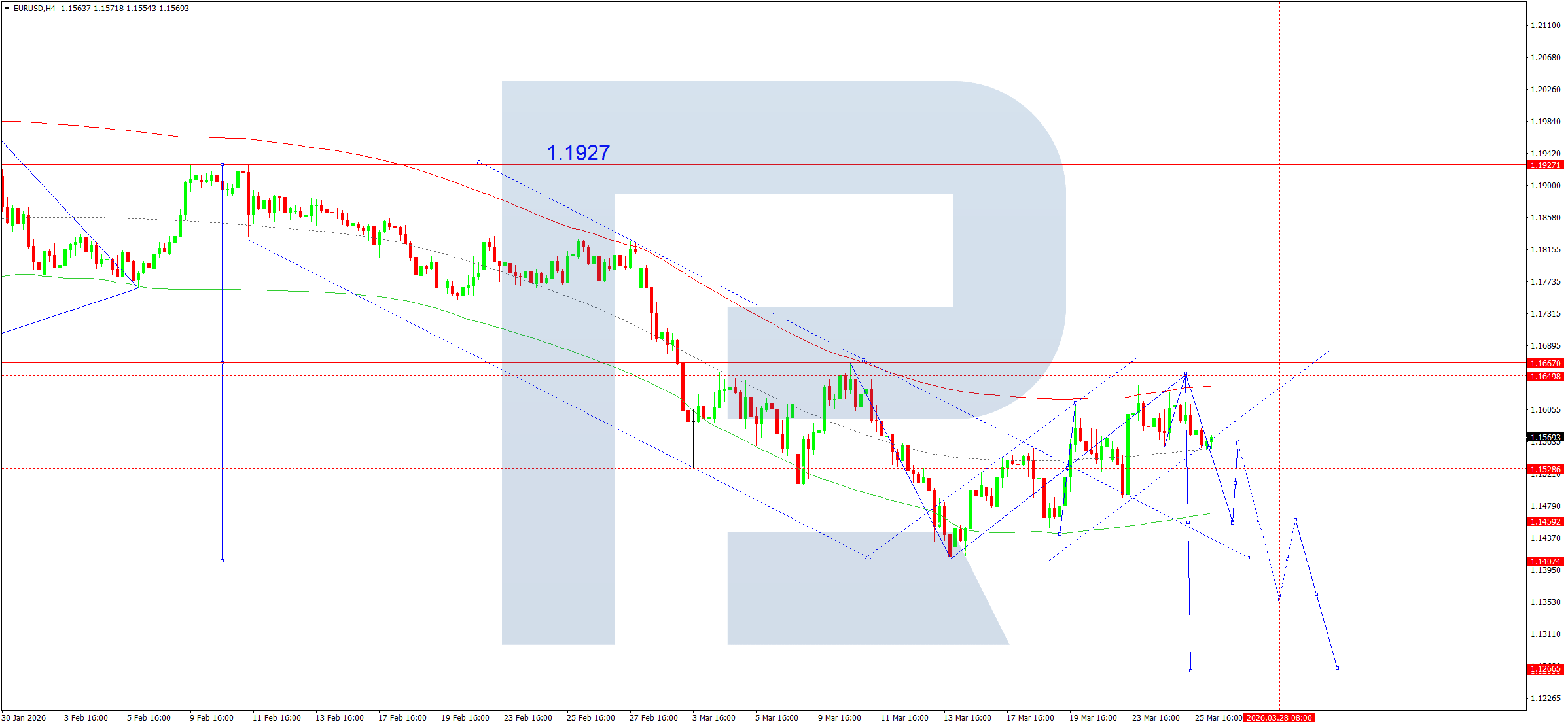 EURUSD жұбының H4 графигінде нарық 1.1543 деңгейіне дейін төмендеу толқынын аяқтады. Бүгін, 26 наурыз 2026, осы деңгей маңында консолидация диапазоны қалыптасады деп күтіледі. Жоғары бағытта бұзылу 1.1650 деңгейіне дейін түзетудің жалғасу әлеуетін ашады, ал төмен бағытта бұзылу төмендеу толқынын 1.1455 деңгейіне дейін, әрі қарай 1.1266 деңгейіне дейін кеңейтуі мүмкін.