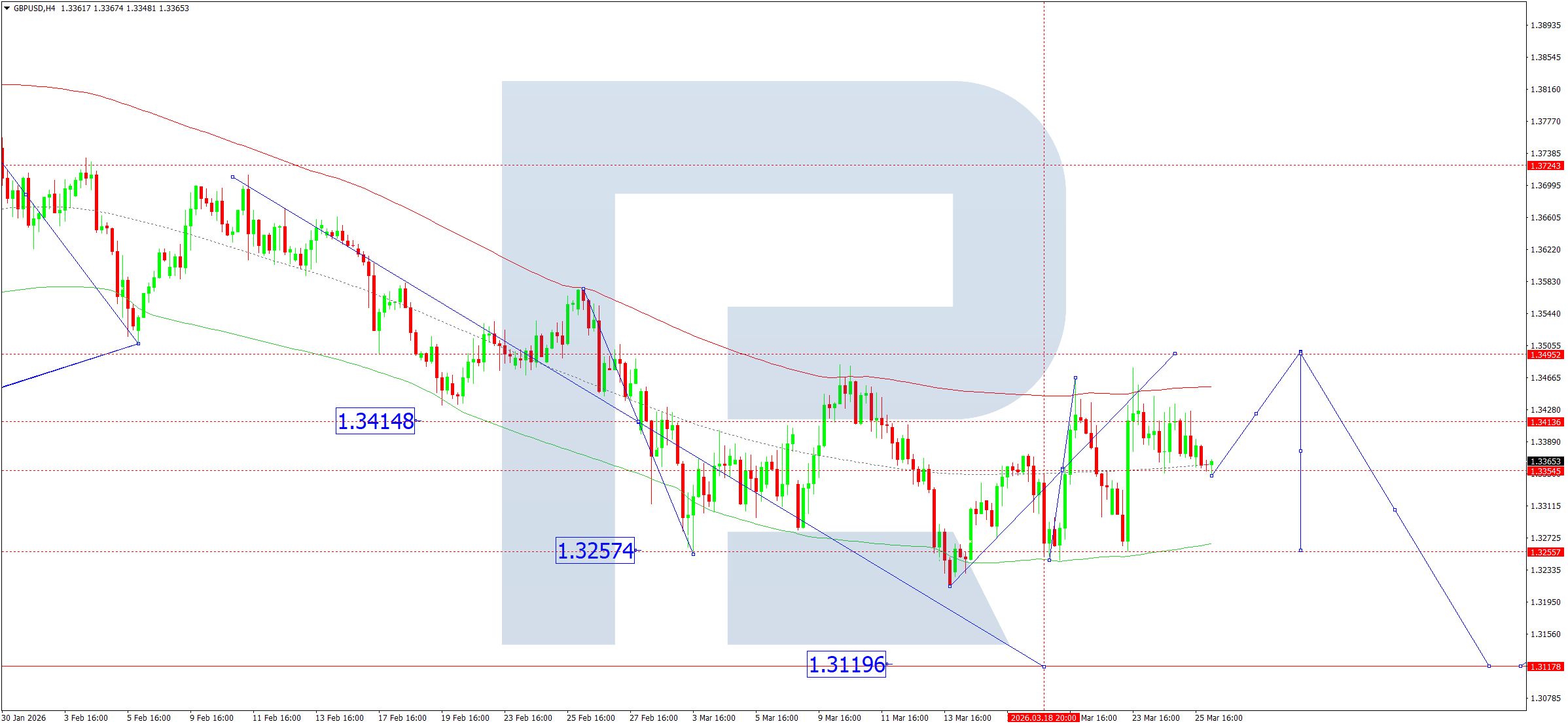 GBPUSD жұбының H4 графигінде нарық 1.3355 деңгейіне дейін төмендеу толқынын қалыптастырды. Бүгін, 26 наурыз 2026, осы деңгейден жоғары консолидация диапазонының дамуы күтіледі. Төмен бағытта бұзылу 1.3255 деңгейіне дейін төмендеуді ашады. Ал жоғары бағытта бұзылу жұпты жергілікті мақсат 1.3494 деңгейіне дейін жеткізуі мүмкін. Осы деңгейге жеткеннен кейін баға 1.3255 деңгейіне дейін қайта төмендеуі ықтимал.