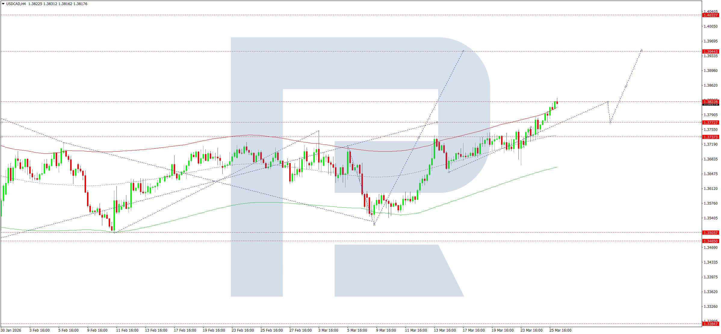 USDCAD жұбының H4 графигінде нарық 1.3944 деңгейіне қарай өсу толқынын қалыптастыруда. Бүгін, 26 наурыз 2026, 1.3777 деңгейіне дейін түзету қозғалысы мүмкін. Одан кейін 1.3944 деңгейіне дейін өсу күтіледі.
