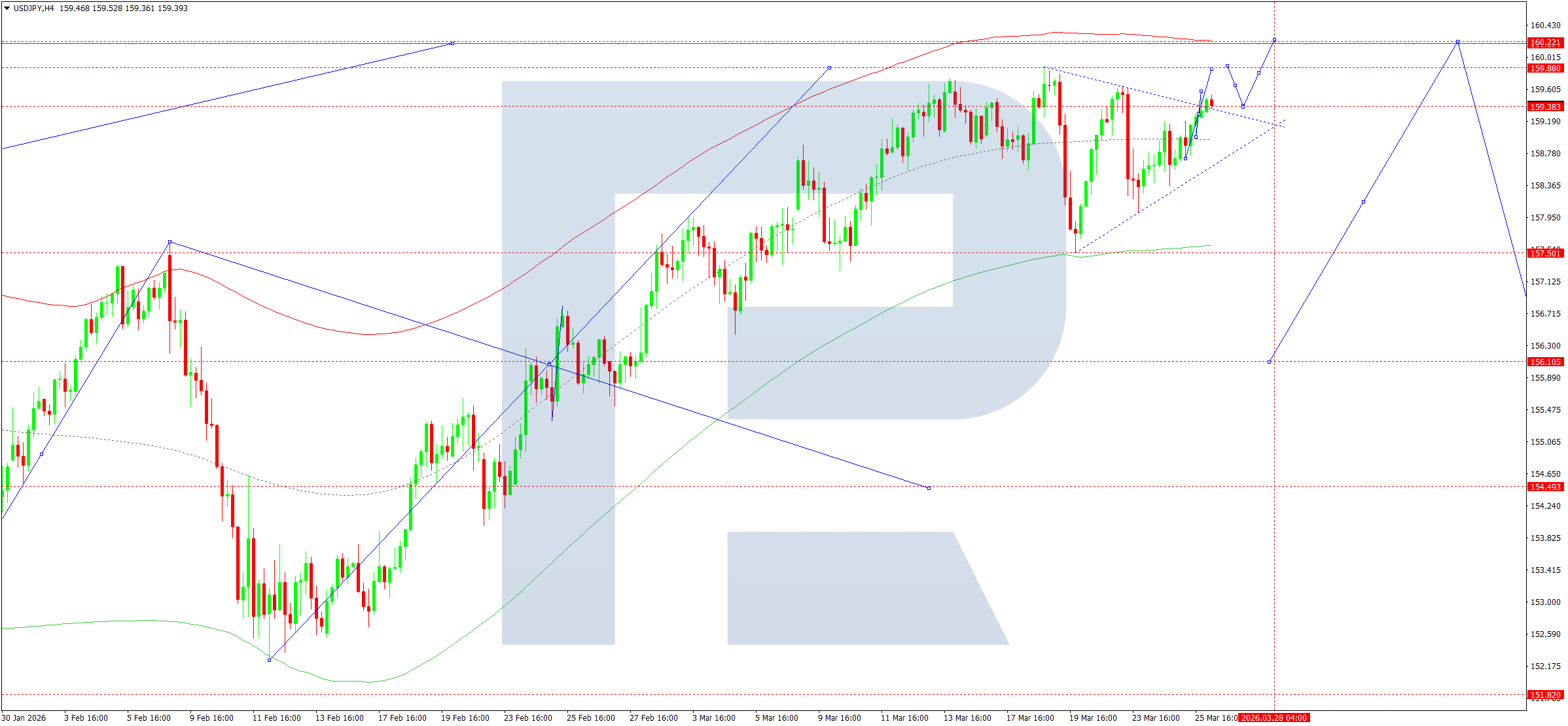 USDJPY жұбының H4 графигінде нарық 159.39 деңгейінен жоғары бұзылып, 159.80 бағытына қарай өсу толқынын қалыптастыруда. Бүгін, 26 наурыз 2026, баға 159.88 деңгейіне дейін өсуі күтіледі. Кейін осы деңгей маңында консолидация диапазоны қалыптасуы мүмкін. Жоғары бағытта бұзылу 160.10 деңгейіне дейін қозғалысты ашады, ал төмен бағытта бұзылу 157.50 деңгейіне дейін түзету толқынын тудыруы мүмкін.