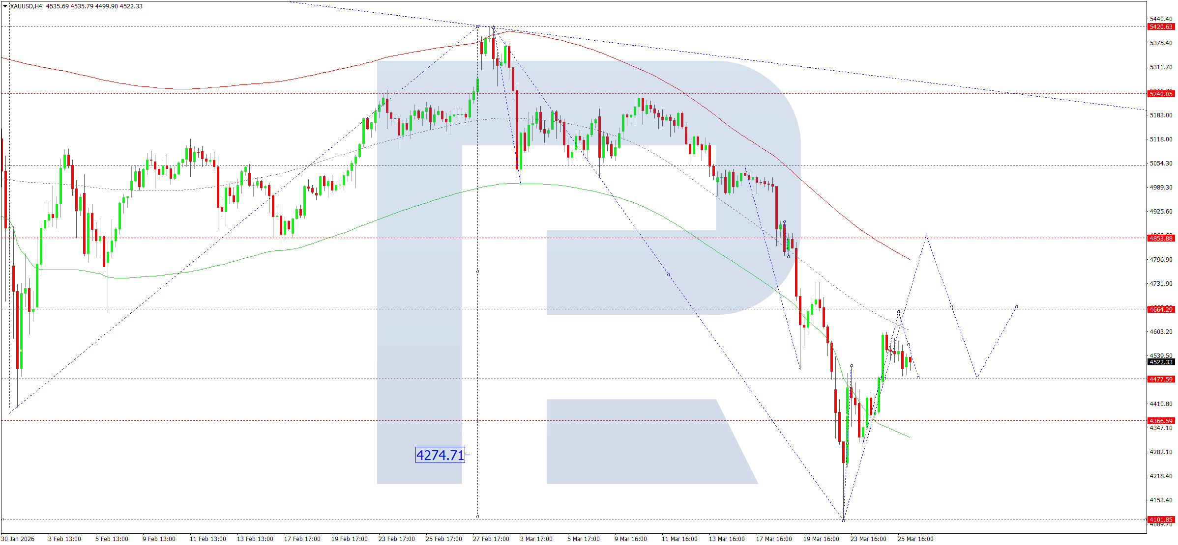 XAUUSD H4 графигінде нарық 4,545 деңгейінен төмен бұзылып, 4,438 бағытына қарай түзету толқынын қалыптастыруда. Бүгін, 26 наурыз 2026, бағаның осы мақсатқа жетуі күтіледі. Кейін 4,666 деңгейіне дейін өсу толқыны басталуы мүмкін және тренд 4,850 деңгейіне дейін жалғасуы ықтимал. Балама сценарийде, төмен бағытта бұзылу 4,360 деңгейіне дейін тағы бір төмендеуді тудыруы мүмкін.
