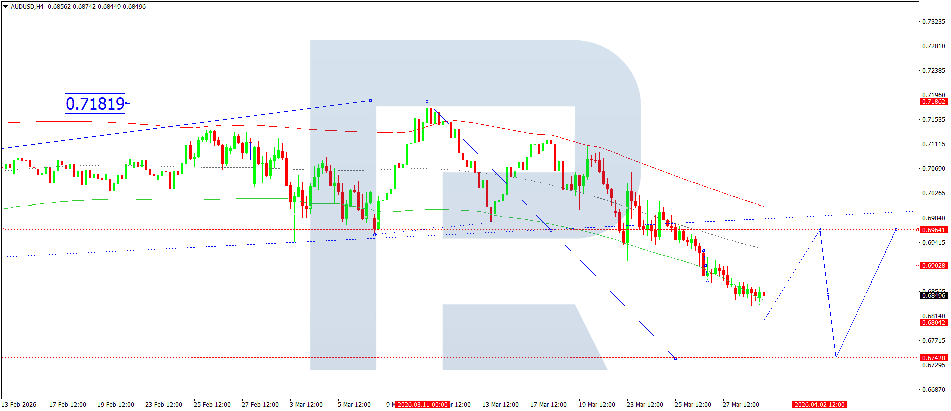 AUDUSD жұбының H4 графигінде нарық 0.6868 деңгейінен төмен бұзылып, 0.6800 бағытына қарай төмендеу толқынын қалыптастыруда. Бүгін, 31 наурыз 2026, 0.6840 деңгейі маңында консолидация диапазоны қалыптасады деп күтіледі. Төмен бағытта бұзылу 0.6800 деңгейіне дейін төмендеуді жалғастырады. Ал жоғары бағытта бұзылу 0.6940 деңгейіне дейін өсу толқынын ашады.