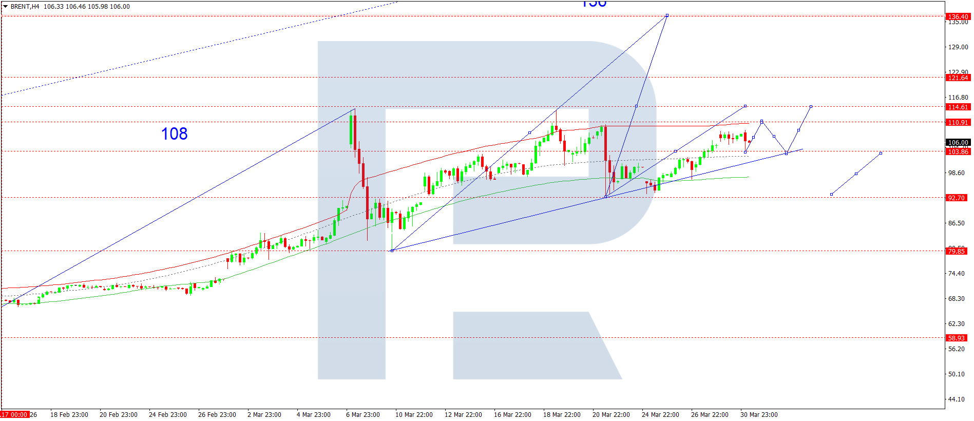 Brent мұнайының H4 графигінде нарық 108.88 деңгейіне дейін өсу толқынын аяқтады. Бүгін, 31 наурыз 2026, осы деңгейден төмен консолидация диапазоны қалыптасуы мүмкін. Жоғары бағытта бұзылу 114.60 деңгейіне дейін өсу әлеуетін ашады және тренд 136.40 деңгейіне дейін жалғасуы мүмкін. Мақсат – жергілікті. Төмен бағытта бұзылу 103.00 деңгейіне дейін түзету толқынын тудыруы мүмкін, содан кейін 114.60 деңгейіне дейін өсу ықтимал.