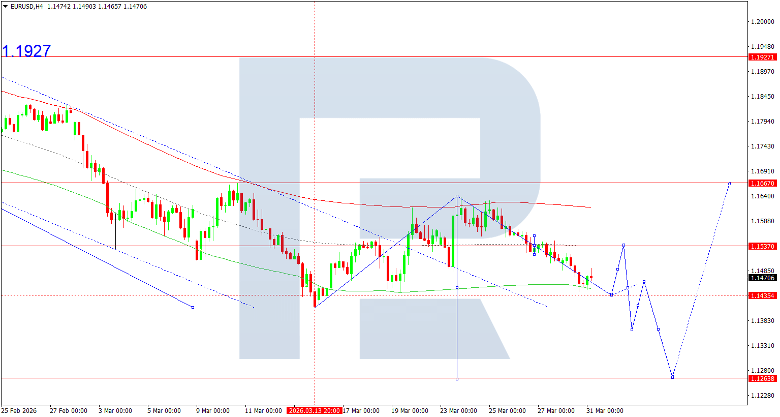 EURUSD жұбының H4 графигінде нарық 1.1443 деңгейіне дейін төмендеу толқынын аяқтады. Бүгін, 31 наурыз 2026, осы деңгей маңында консолидация диапазоны қалыптасады деп күтіледі. Жоғары бағытта бұзылу 1.1500 деңгейіне дейін түзетудің жалғасу әлеуетін ашады, ал төмен бағытта бұзылу төмендеу толқынын 1.1434 деңгейіне дейін кеңейтуі мүмкін, әрі қарай 1.1360 деңгейіне дейін жалғасу ықтималдығы бар.