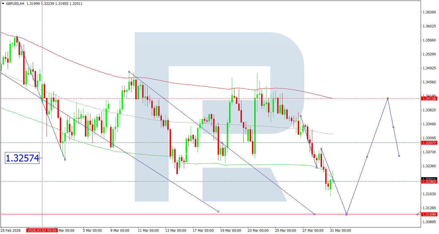 GBPUSD жұбының H4 графигінде нарық 1.3158 деңгейіне дейін төмендеу толқынын қалыптастырды. Бүгін, 31 наурыз 2026, осы деңгейден жоғары консолидация диапазонының дамуы күтіледі. Төмен бағытта бұзылу 1.3100 деңгейіне дейін төмендеуді ашады. Ал жоғары бағытта бұзылу 1.3232 деңгейіне дейін өсу толқынын ашады. Осы деңгейге жеткеннен кейін баға 1.3000 деңгейіне дейін төмендеуі мүмкін. Мақсат – жергілікті.