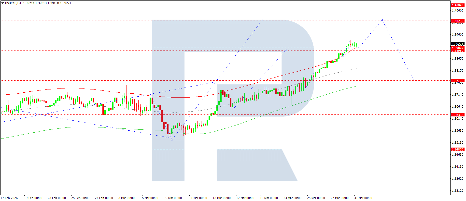 USDCAD жұбының H4 графигінде нарық 1.3940 деңгейіне дейін өсу толқынын аяқтады. Бүгін, 31 наурыз 2026, 1.3911 деңгейіне дейін түзету қозғалысы мүмкін. Одан кейін 1.4020 деңгейіне дейін өсу күтіледі.