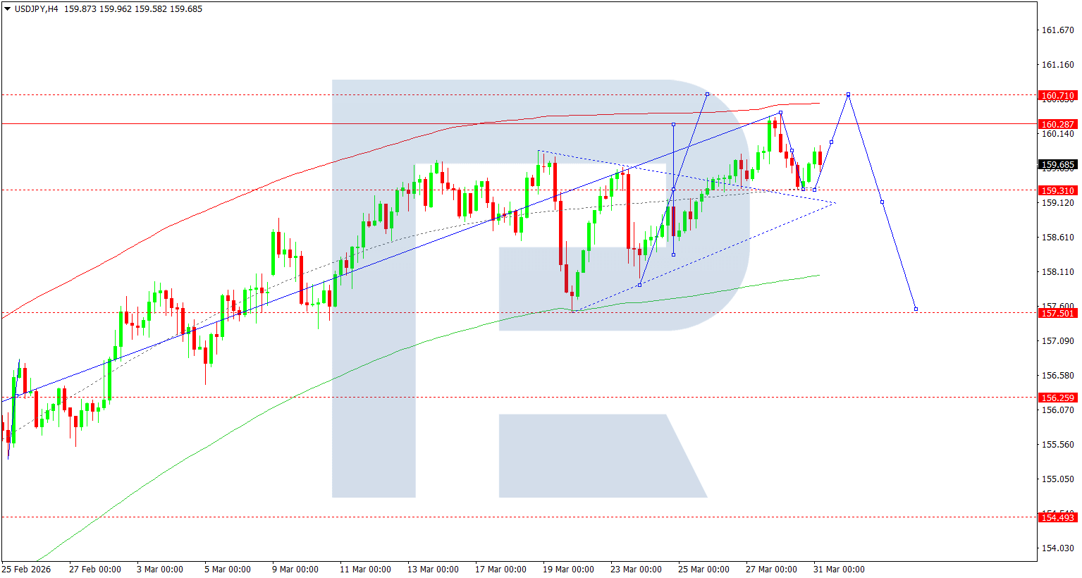 USDJPY жұбының H4 графигінде нарық 159.30 деңгейіне дейін төмендеу құрылымын аяқтап, 159.90 деңгейіне дейін түзетілді (төменнен қайта тестілеу). Бүгін, 31 наурыз 2026, осы деңгей маңында консолидация диапазоны қалыптасты. Жоғары бағытта бұзылу 160.70 деңгейіне дейін өсу толқынын ашады, ал төмен бағытта бұзылу 158.80 деңгейіне дейін түзету толқынын тудыруы мүмкін.