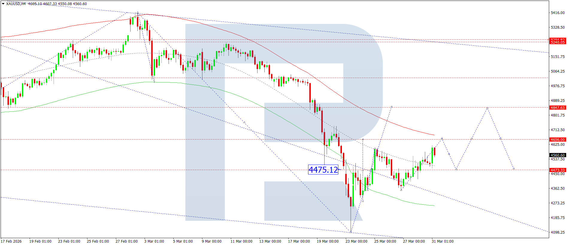 XAUUSD H4 графигінде нарық 4,500 деңгейінен жоғары бұзылып, 4,656 бағытына қарай өсу толқынын қалыптастыруда. Бүгін, 31 наурыз 2026, осы мақсат деңгейіне жету күтіледі. Кейін осы деңгейден жоғары консолидация диапазоны дамуы мүмкін. Жоғары бағытта бұзылу 4,848 деңгейіне дейін өсу әлеуетін ашады және тренд 4,855 деңгейіне дейін жалғасуы мүмкін. Балама сценарийде, төмен бағытта бұзылу 4,500 деңгейіне дейін тағы бір төмендеу толқынын тудыруы мүмкін. Мақсат – жергілікті.