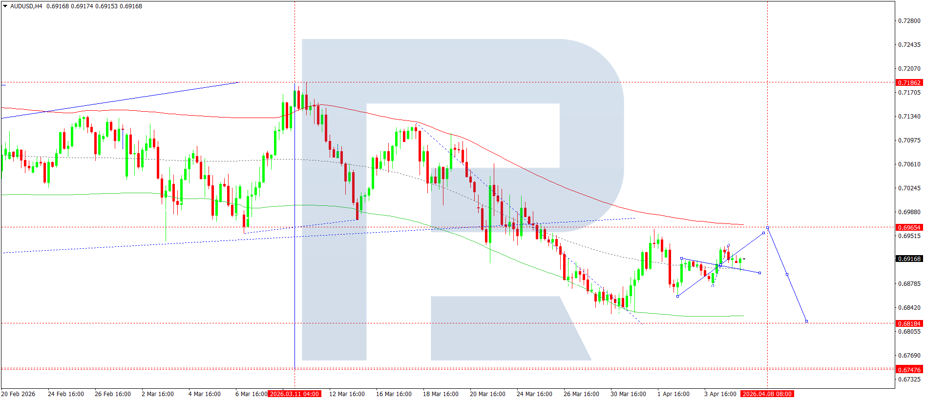 AUDUSD жұбының H4 графигінде нарық 0.6900 деңгейі маңында консолидация диапазонын қалыптастырды. Бүгін, 2026 жылғы 7 сәуірде, алдымен 0.6969 деңгейіне дейін өсу, кейін 0.6818 деңгейіне дейін төмендеу күтіледі (жергілікті мақсат).