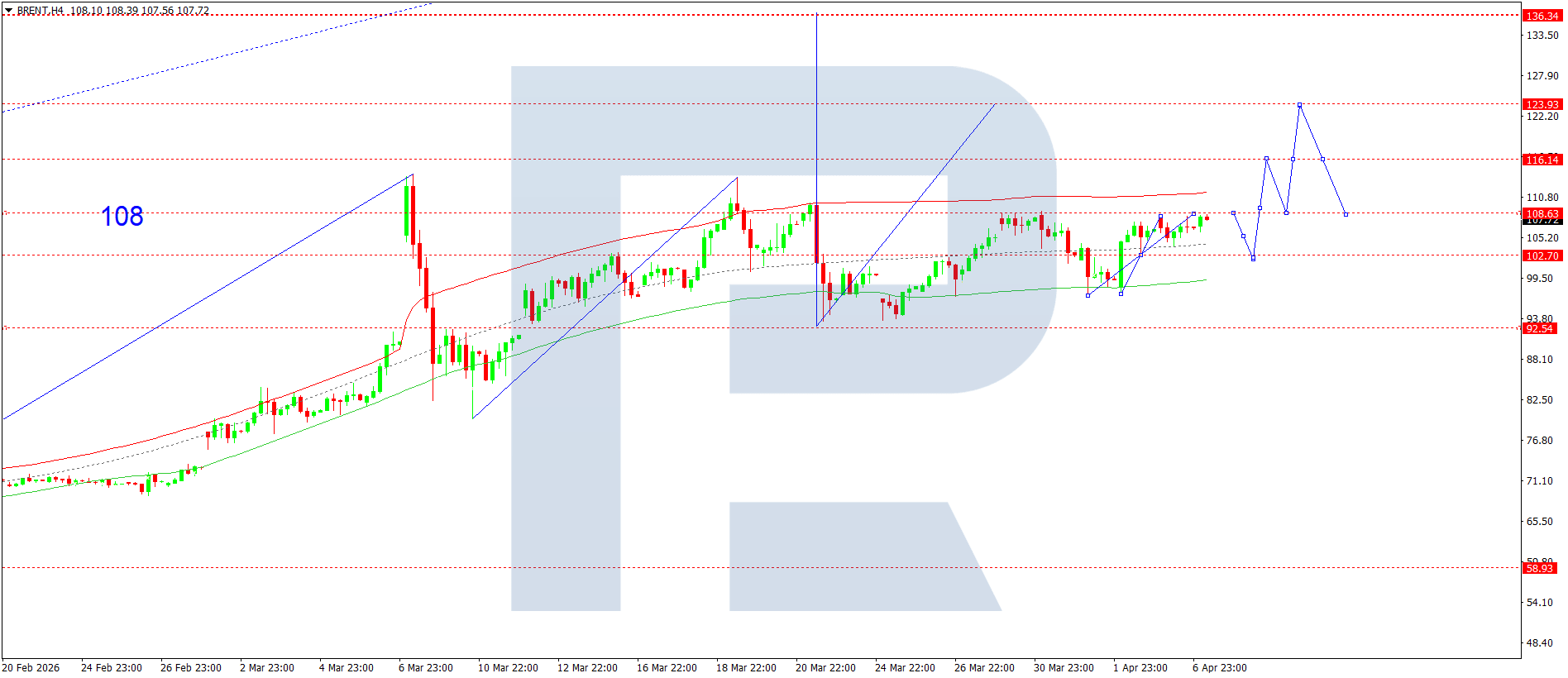 Brent мұнайының H4 графигінде нарық 108.39 деңгейіне дейін өсу толқынын аяқтады. Бүгін, 2026 жылғы 7 сәуірде, осы деңгейден төмен консолидация диапазоны қалыптасуы мүмкін. Жоғарыға бұзылу 116.16 деңгейіне дейін өсуді ашады және тренд 123.93 жергілікті мақсатқа дейін жалғасуы мүмкін. Төменге бұзылу жағдайында 102.70 деңгейіне дейін түзету, кейін 116.16 деңгейіне дейін өсу ықтимал.
